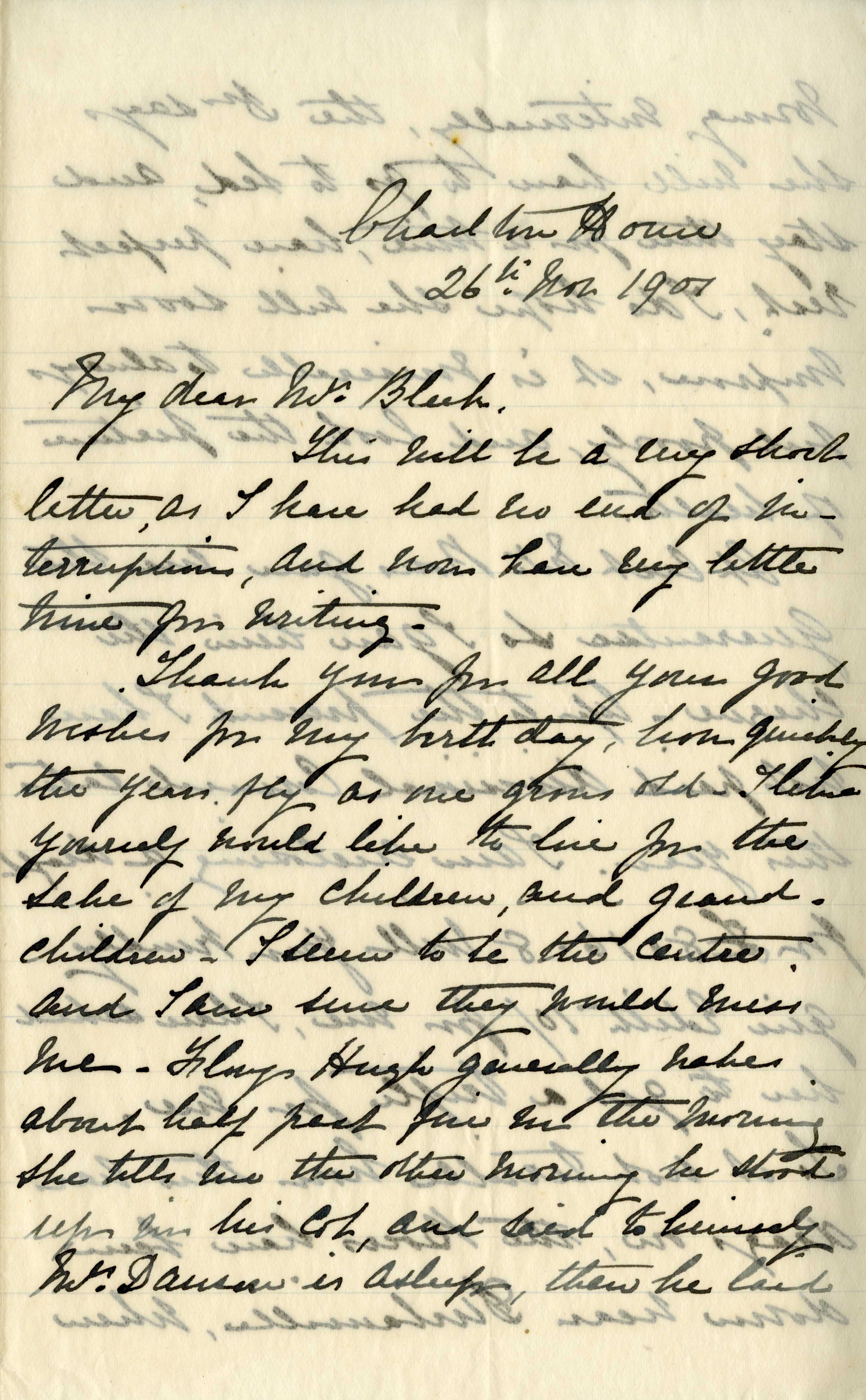 1. The Brights rented Charlton House from Jemima while she and her family lived in Germany. The Brights moved in on 6 June 1887 and Jemima returned in 1904. 2. The letter description is taken from the Bleek-Lloyd Scott Family Archive Catalog 2007. [See Resources on this website]