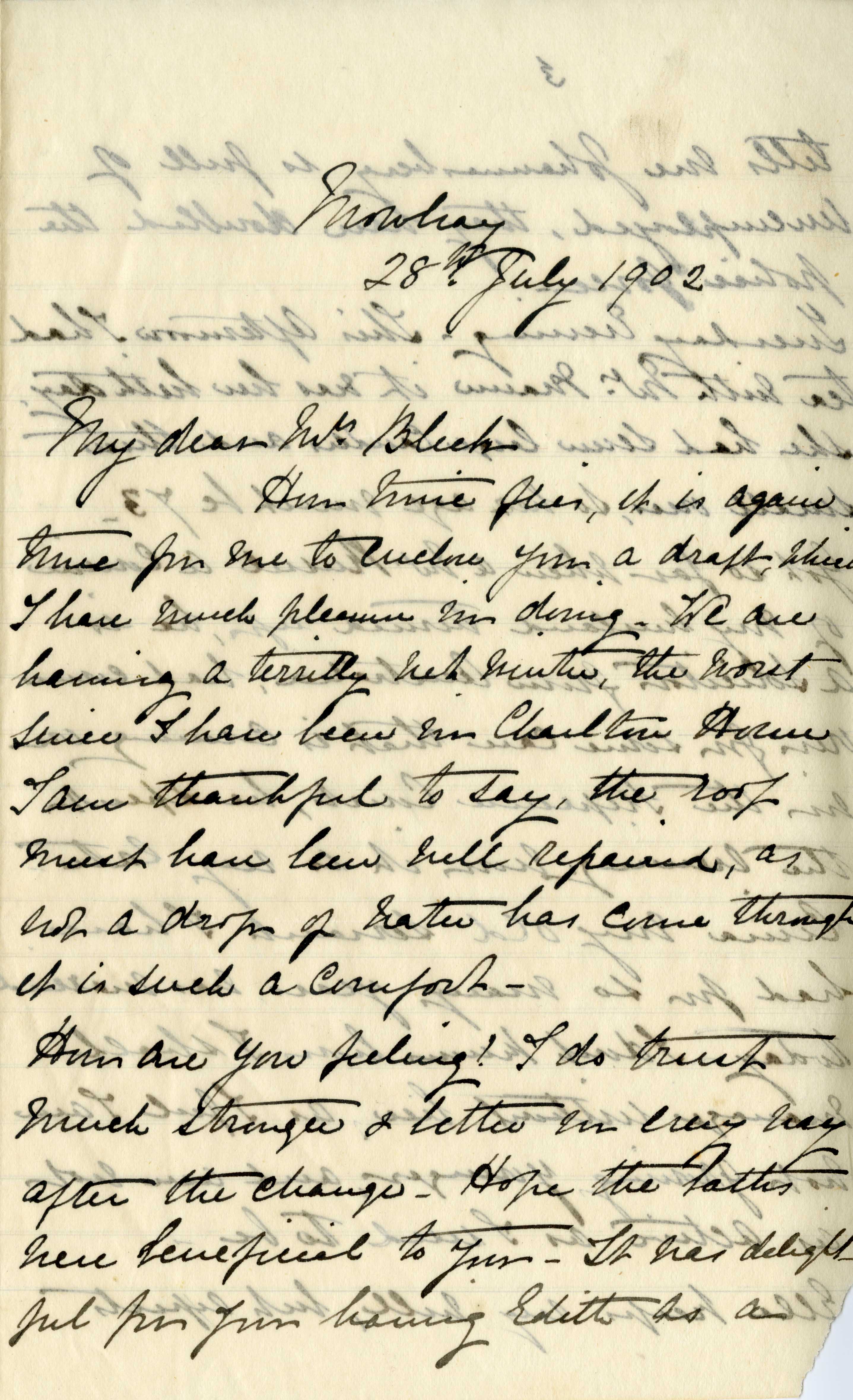 1. The Brights rented Charlton House from Jemima while she and her family lived in Germany. The Brights moved in on 6 June 1887 and Jemima returned in 1904. 2. The letter description is taken from the Bleek-Lloyd Scott Family Archive Catalog 2007. [See Resources on this website]