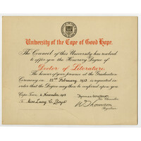 Envelope addressed to "Miss L.C. Lloyd" from the Council of the University of the Cape of Good Hope containing the official announcement of its decision to offer her the Honorary Degree of Doctor of Literature as well as the invitation to attend the graduation ceremony. The envelope is annotated with Lloyd's Mowbray address and "Hon. Doctorate 22 Feb. 1913".