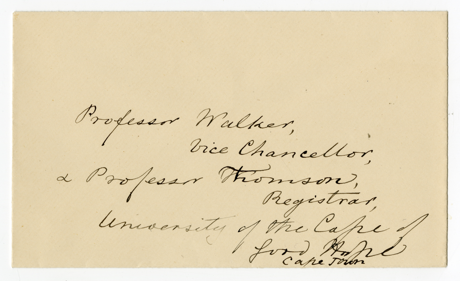 Envelope containing Lucy Lloyd's response [or copy?] to the official announcement from the Council of the University of the Cape of Good Hope regarding its decision to offer her the Honorary Degree of Doctor of Literature; also its invitation to attend the graduation ceremony. Lloyd has addressed the envelope to the Vice Chancellor, Professor Walker, and the Registrar, Professor Thompson.