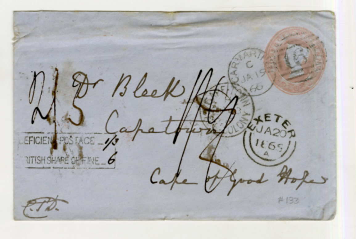 19/20 January 1866, Carmarthen postmark, Exeter postmark, envelope, Dr. Bleek, initials, Wilhelm Bleek