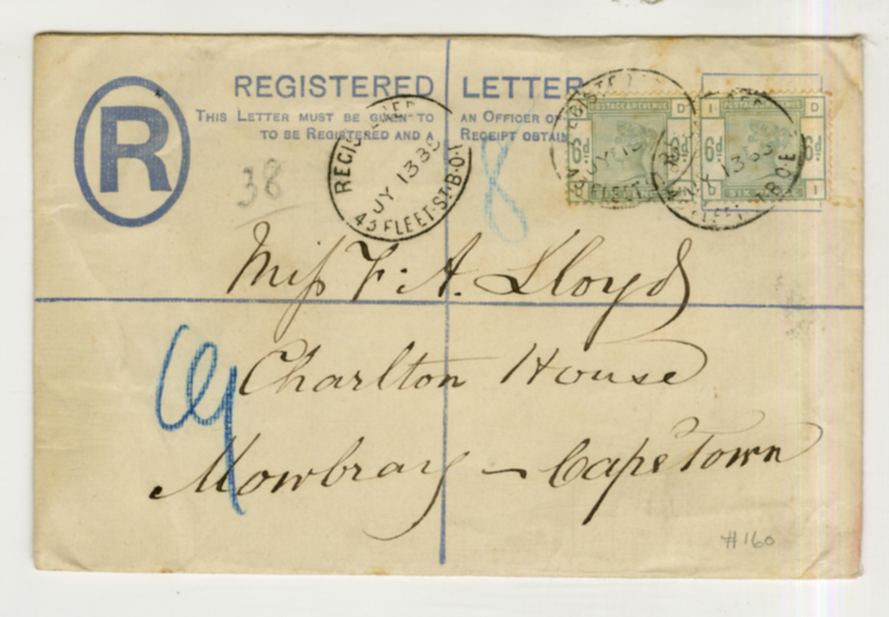 13 July 1885, Charlton House Mowbray, envelope, Fleet St., Frances Lloyd, Miss FA Lloyd, Mowbray, postmark London, registered letter, wax seal