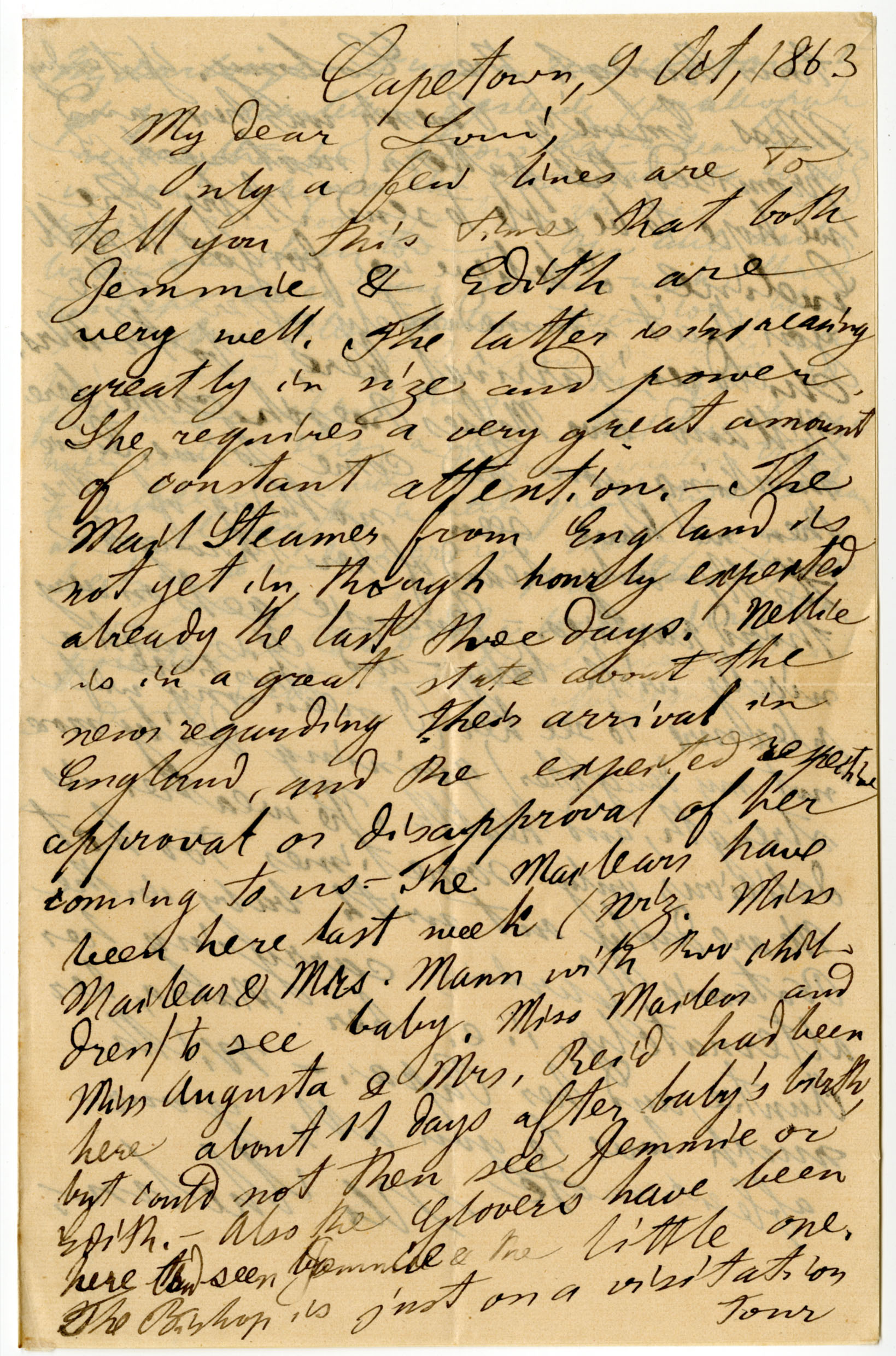 Archdeacon Lloyd, Augusta Maclear, baby, Bella Lloyd, Botanic Gardens, Cape Town, daily activities, daily walks, daughters, development, disapproval, Edith Bleek, Ellen Lloyd, England, half-sisters, health, ill health, Isabella Lloyd, Jemima Bleek, letter, Lloyd sisters, Loui, Lucy Lloyd, Maclear, Miss Maclear, Miss Augusta Maclear, mail steamer, Miss Maclear, Nellie Lloyd, news, October 1863, parents, postscript, Sir Thomas Maclear, visitors, weather, Wilhelm Bleek