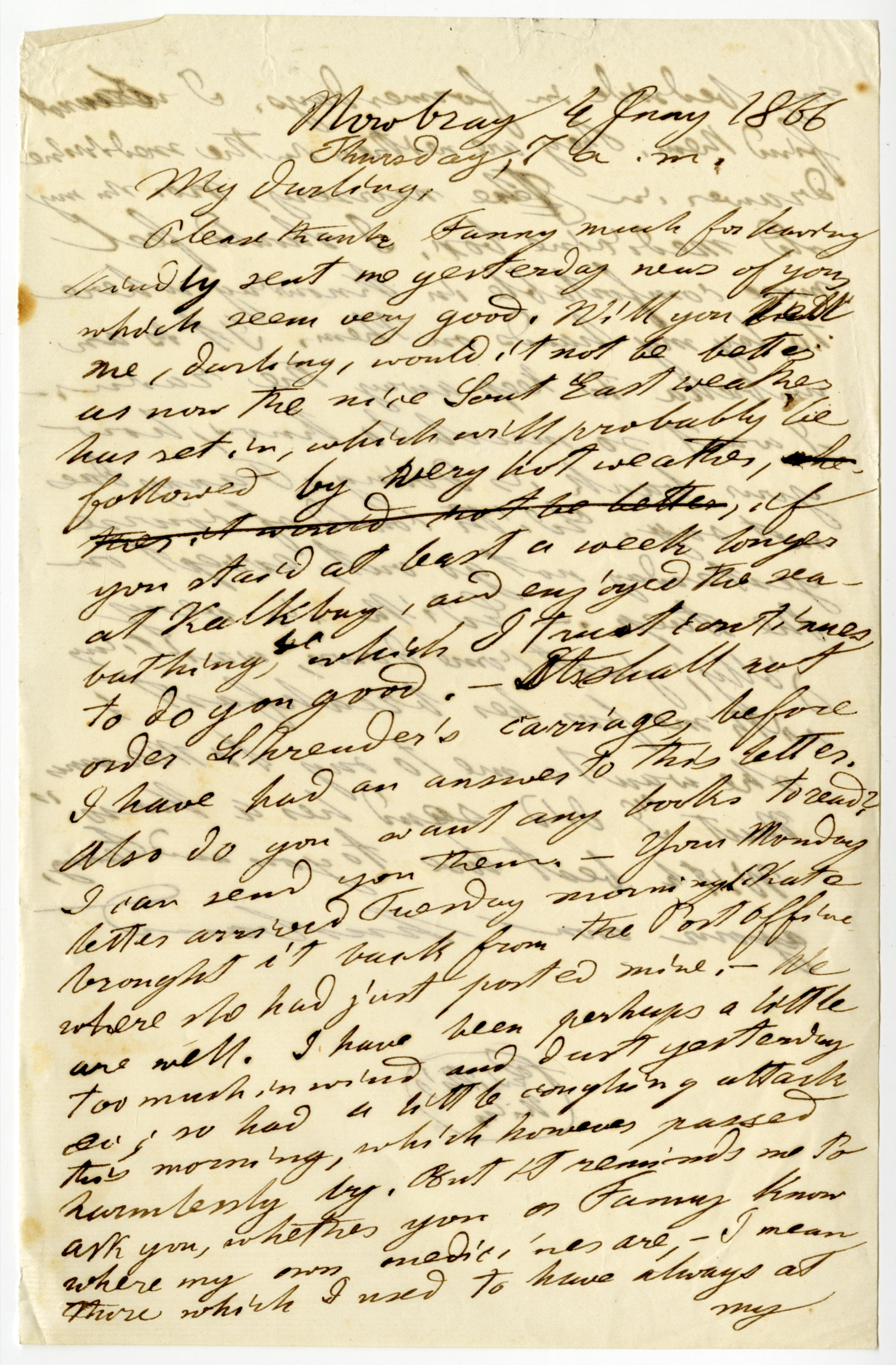age of Edith Bleek, carriage, Edith Bleek, Fanny Lloyd, Frances Lloyd, health, heat, holiday, ill health, January 1866, Jemima Bleek, Kalk Bay, letter, Mowbray, painful back, Schreuder's carriage, seaside, sea bathing, South East weather, weather, Wilhelm Bleek, wind