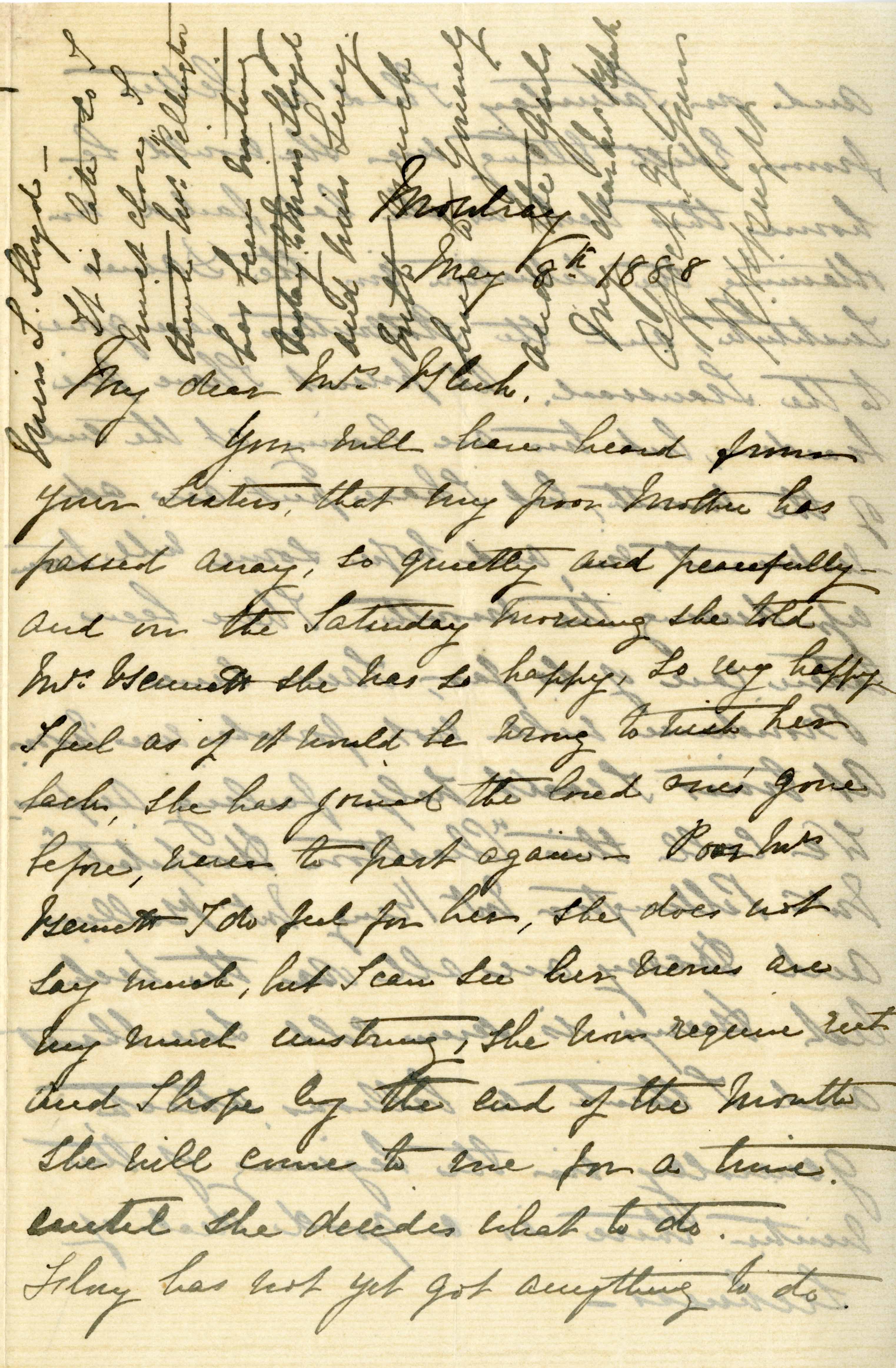 Letter from Katharine Bright to Jemima Bleek, from Charlton House, Mowbray, in Cape Town, 8 May 1888.