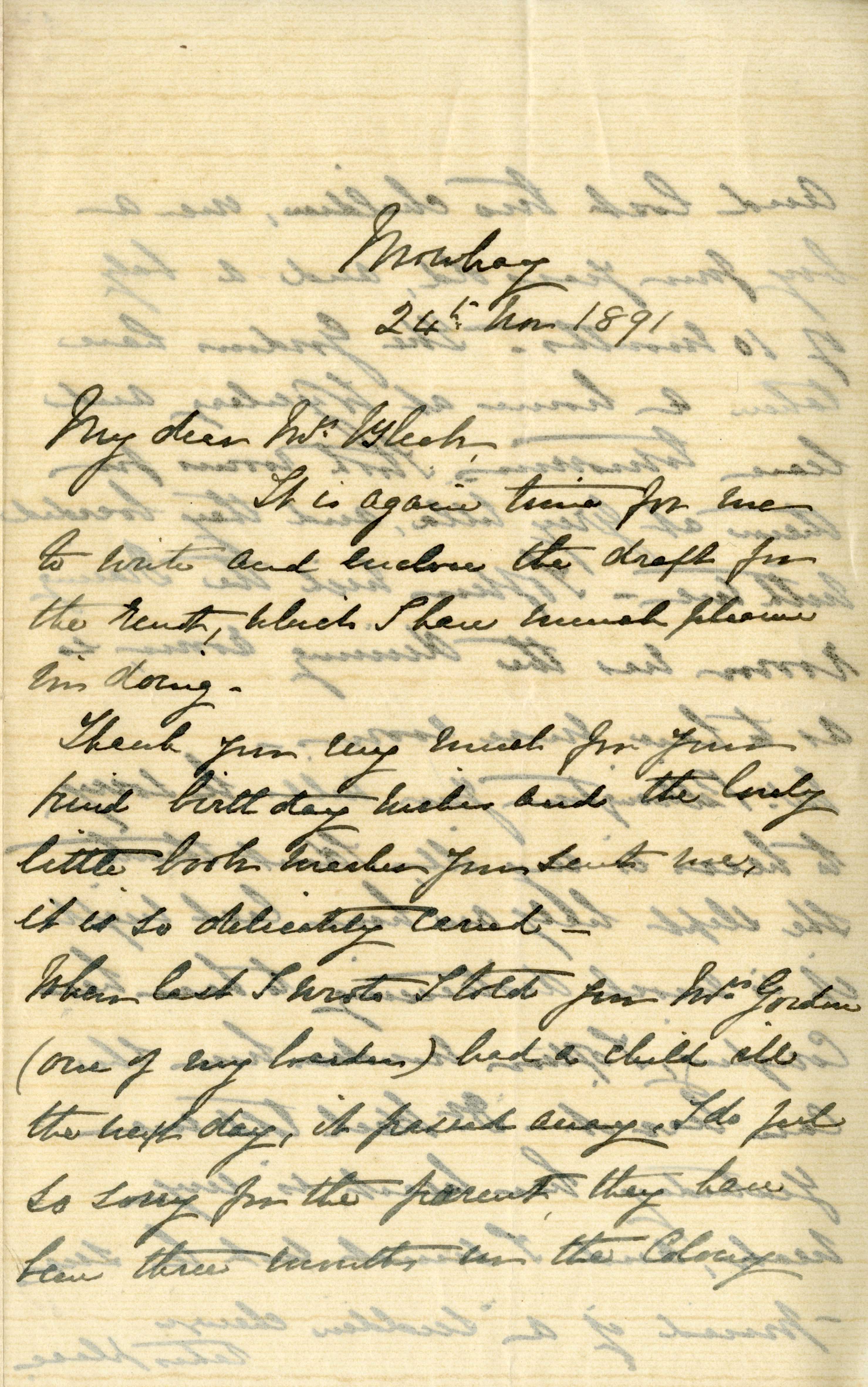 Letter from Katharine Bright to Jemima Bleek, from Mowbray in Cape Town, 24 November 1891.