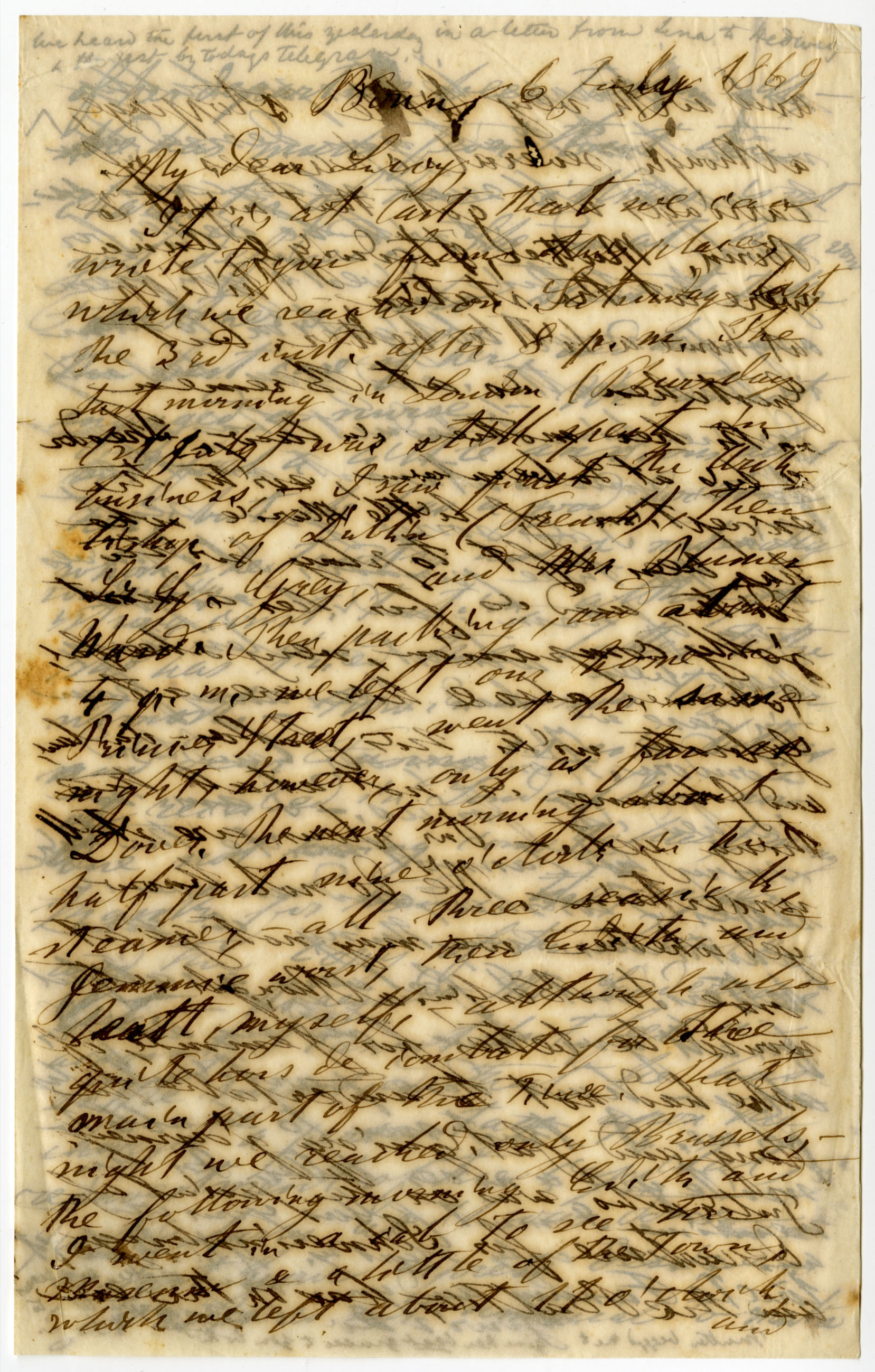 A letter from Wilhelm Bleek to Lucy Lloyd, from Bonn and dated July 6, 1869. Wilhelm, Jemima and Edith have arrived in Bonn. They are anxious as they have just heard that Julia, in Berlin, is very ill and a nurse has been engaged. Wilhelm does not want Jemima to travel to Berlin due to her pregnancy. He discusses Lucy's business with Mr Sanderson and his unexpected charge for reinvesting her [?] capital.