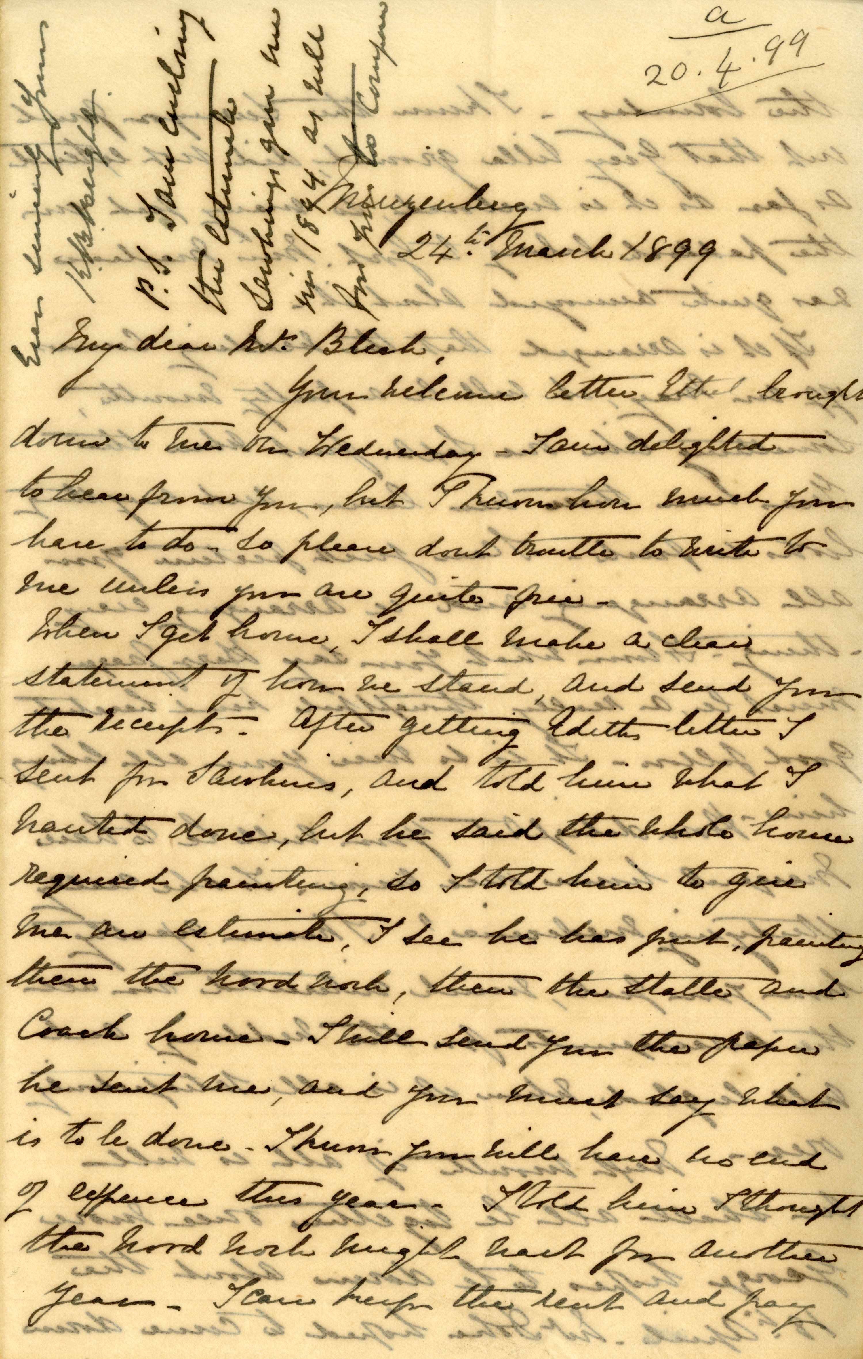 1. The Brights rented Charlton House from Jemima while she and her family lived in Germany. The Brights moved in on 6 June 1887 and Jemima returned in 1904. 2. The letter description is taken from the Bleek-Lloyd Scott Family Archive Catalog 2007. [See Resources on this website]