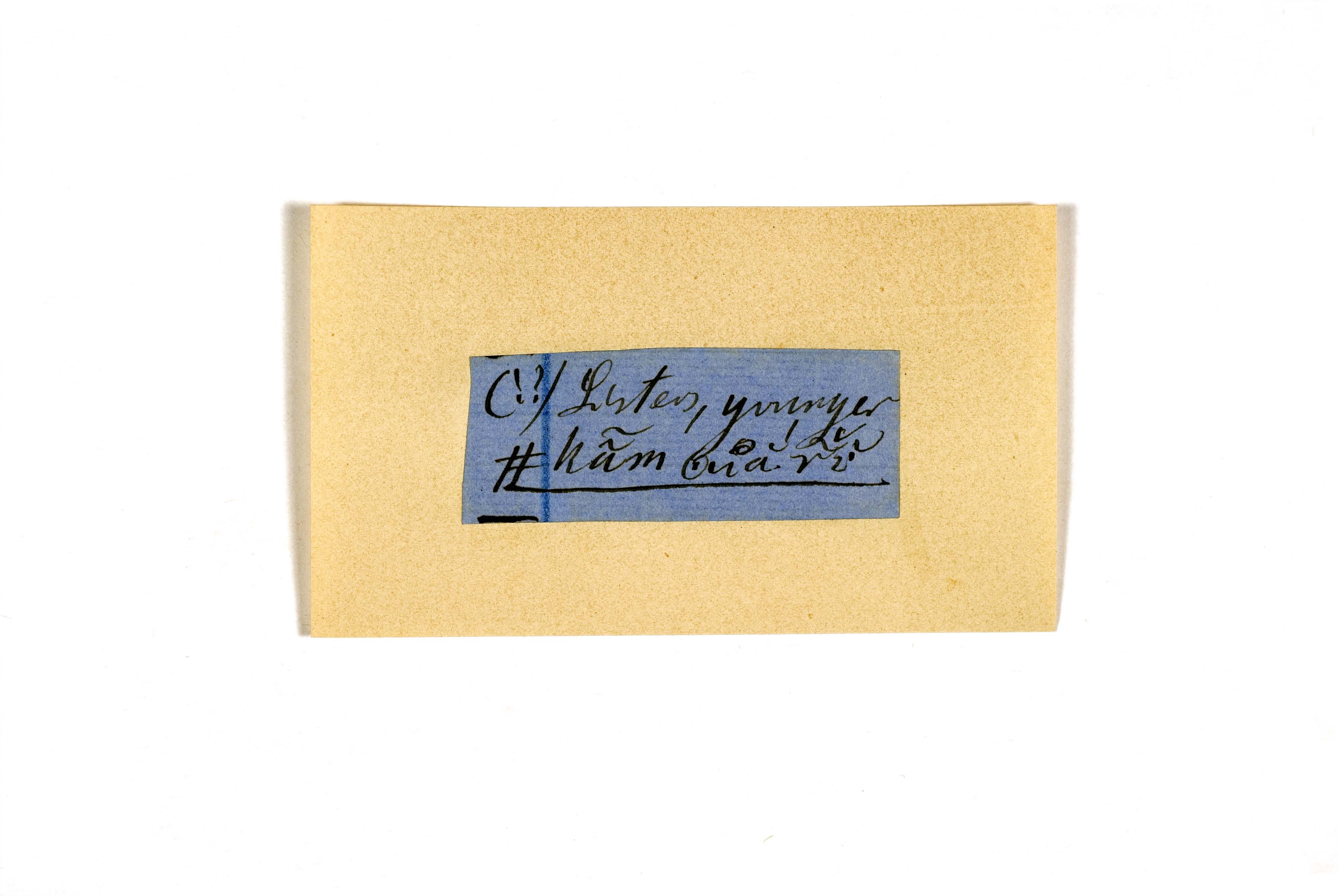 ink on blue paper glued on card