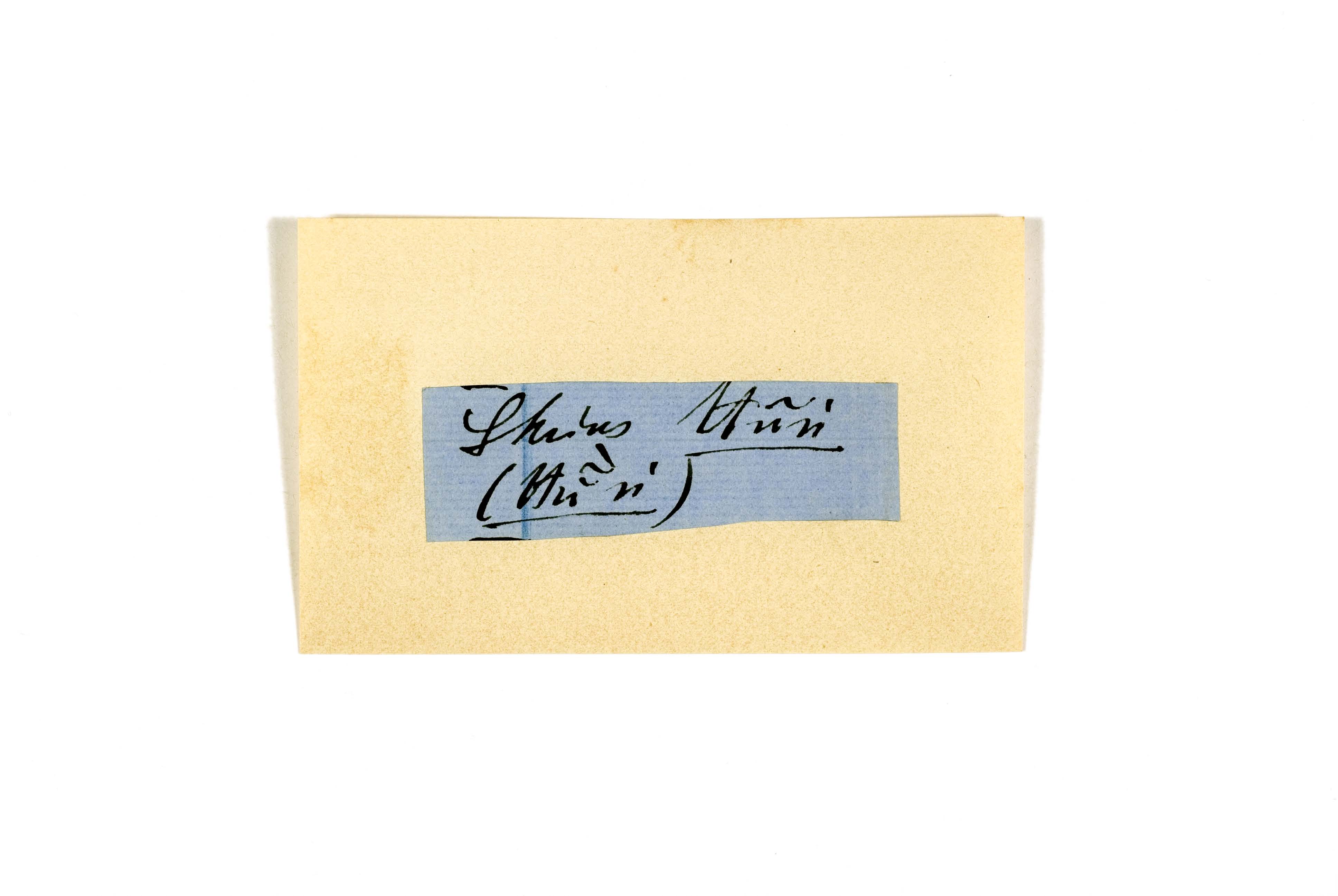 ink on blue paper glued on card