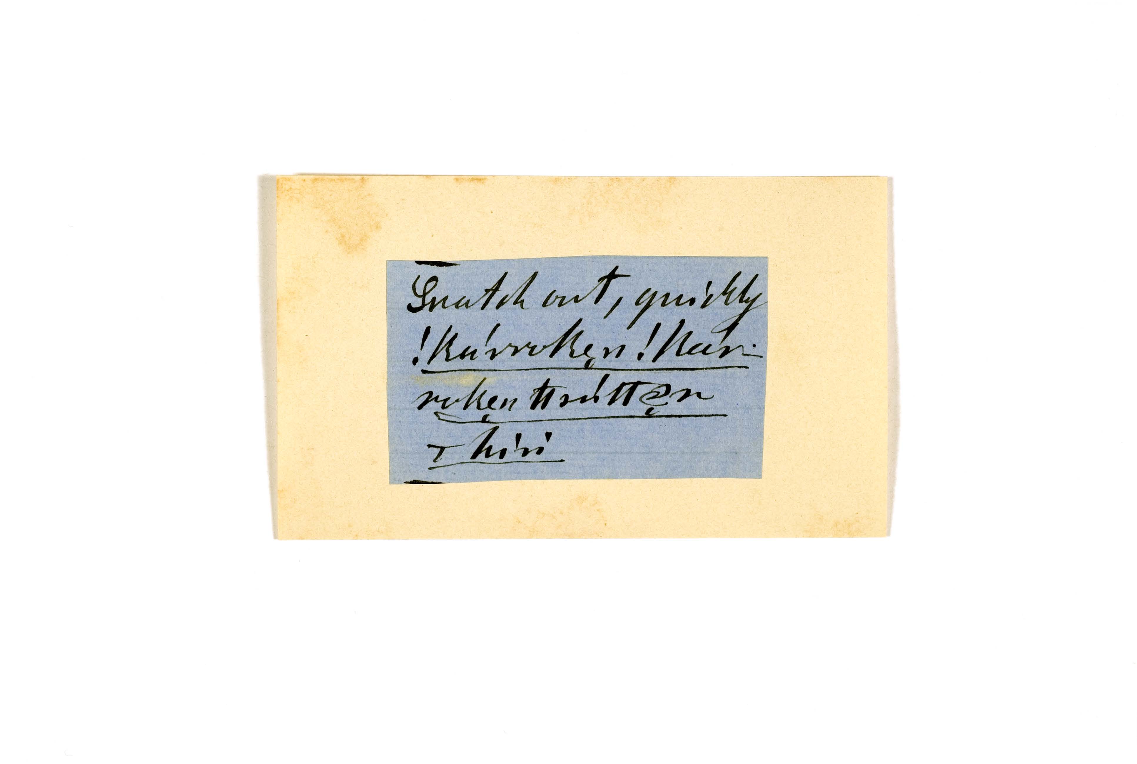 ink on blue paper glued on card