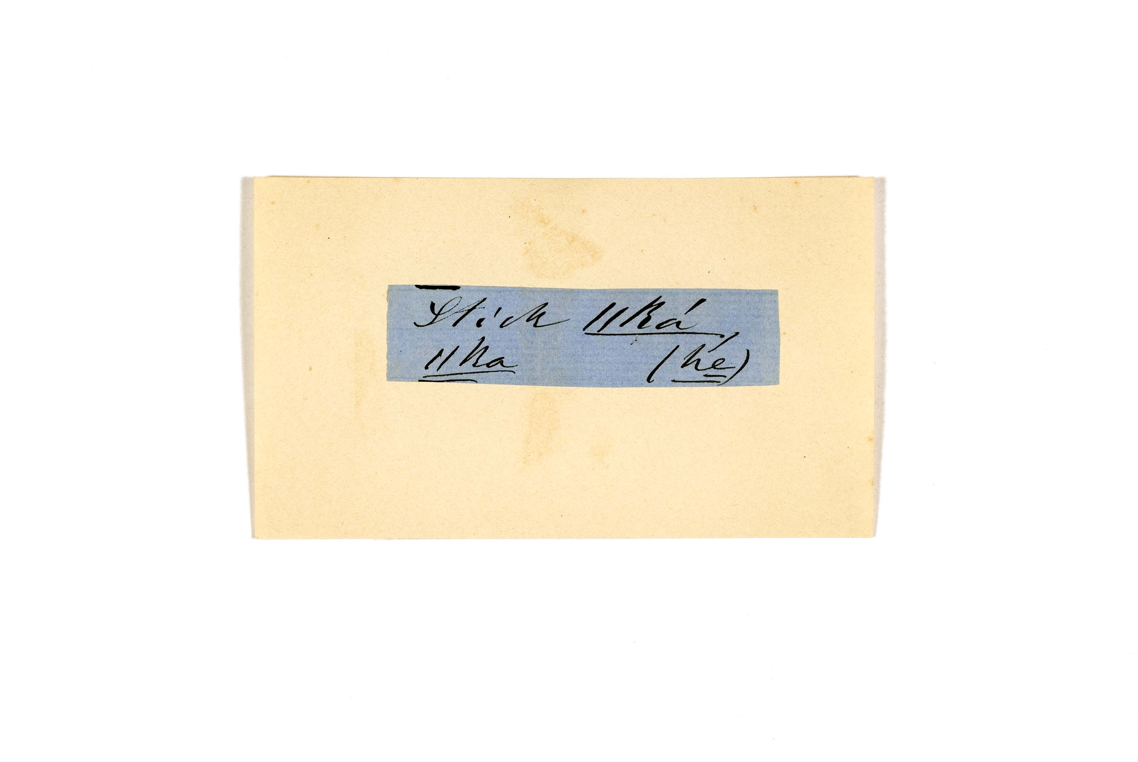 ink on blue paper glued on card