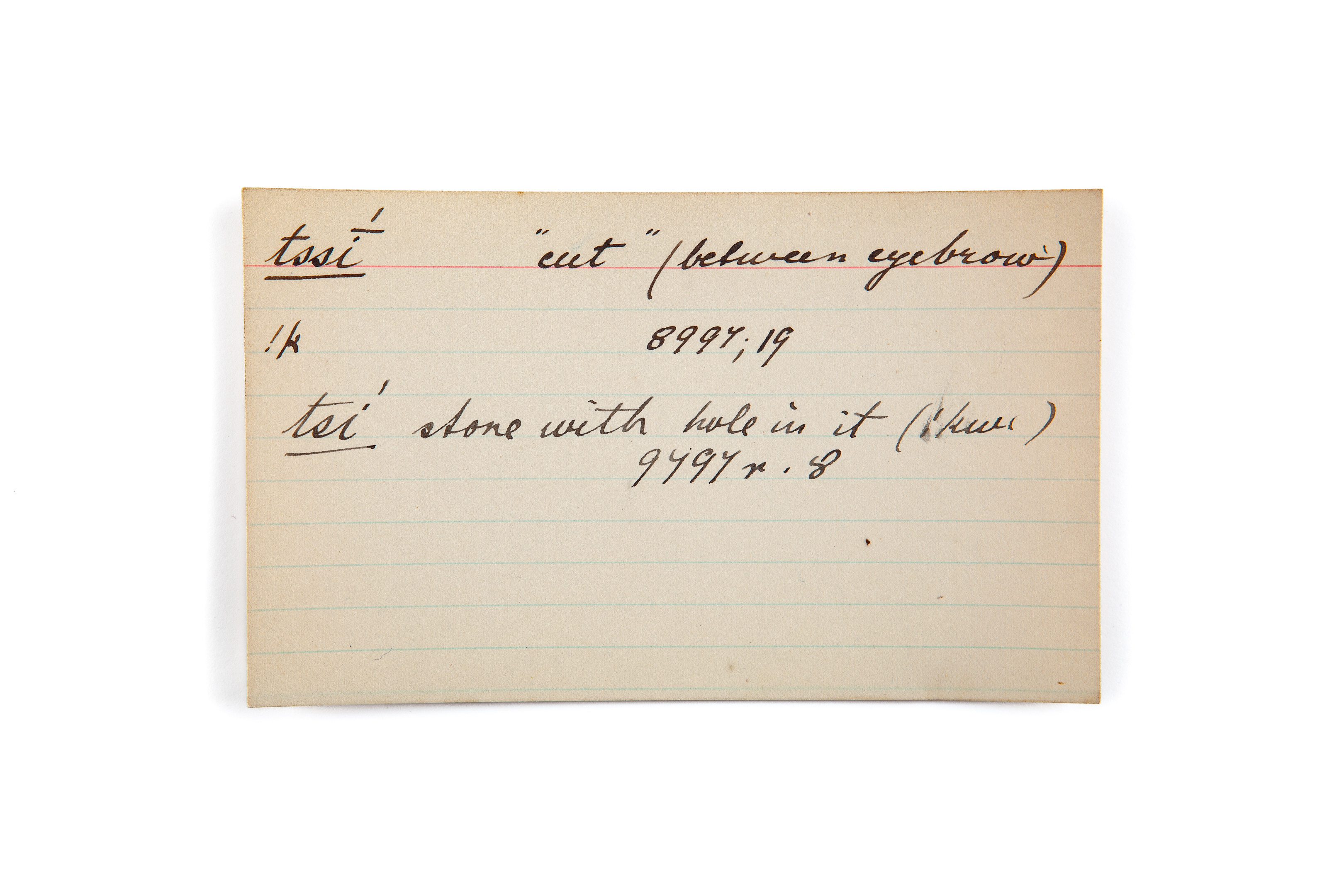 cut (between eyebrow), stone with hole in it