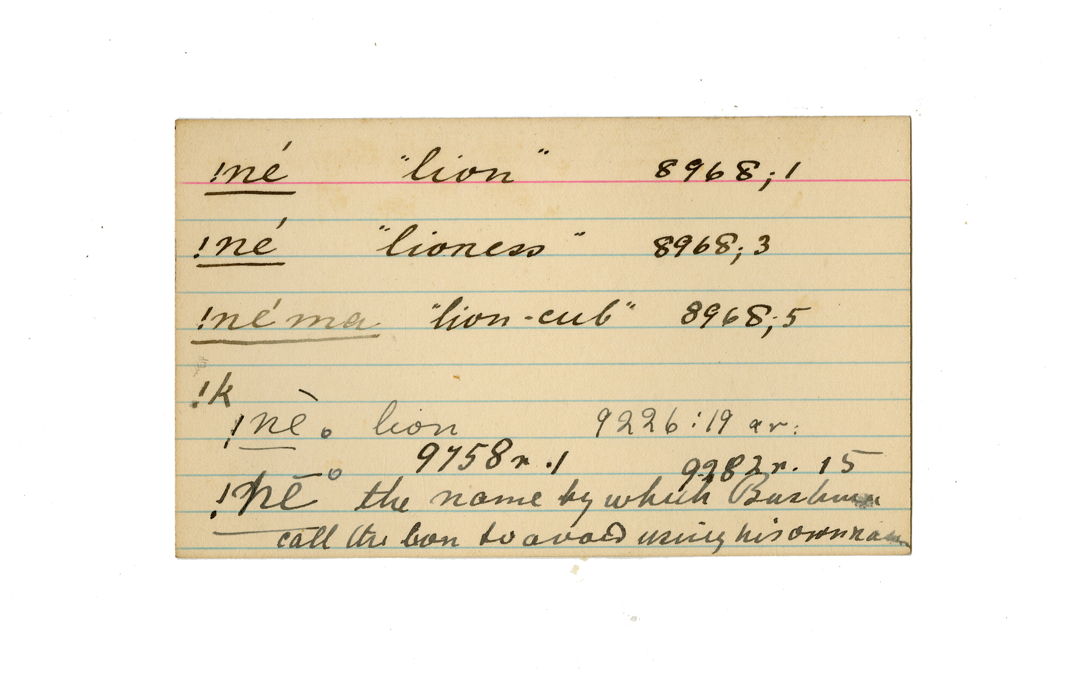 lionness, lion cub, lion (the name by which the Bushman call the lion to avoid using his own name ), name (the )