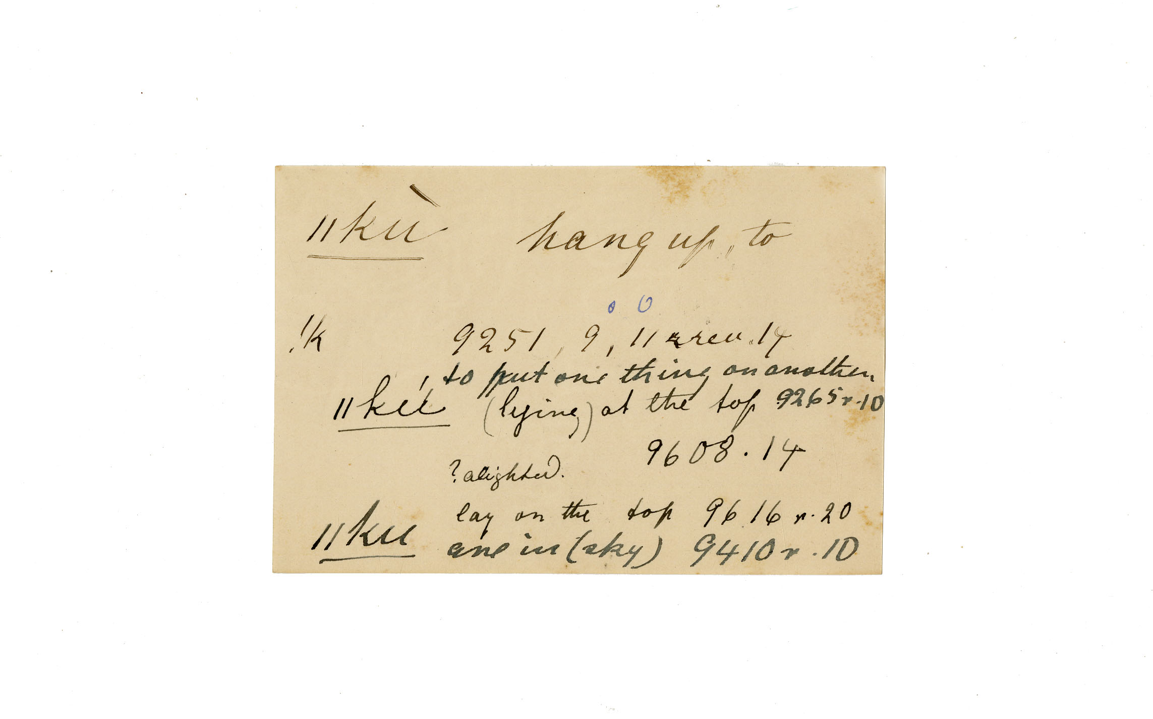 hang up (to), put (one thing on another ), top (lying at the ), alighted, sky (are in the)