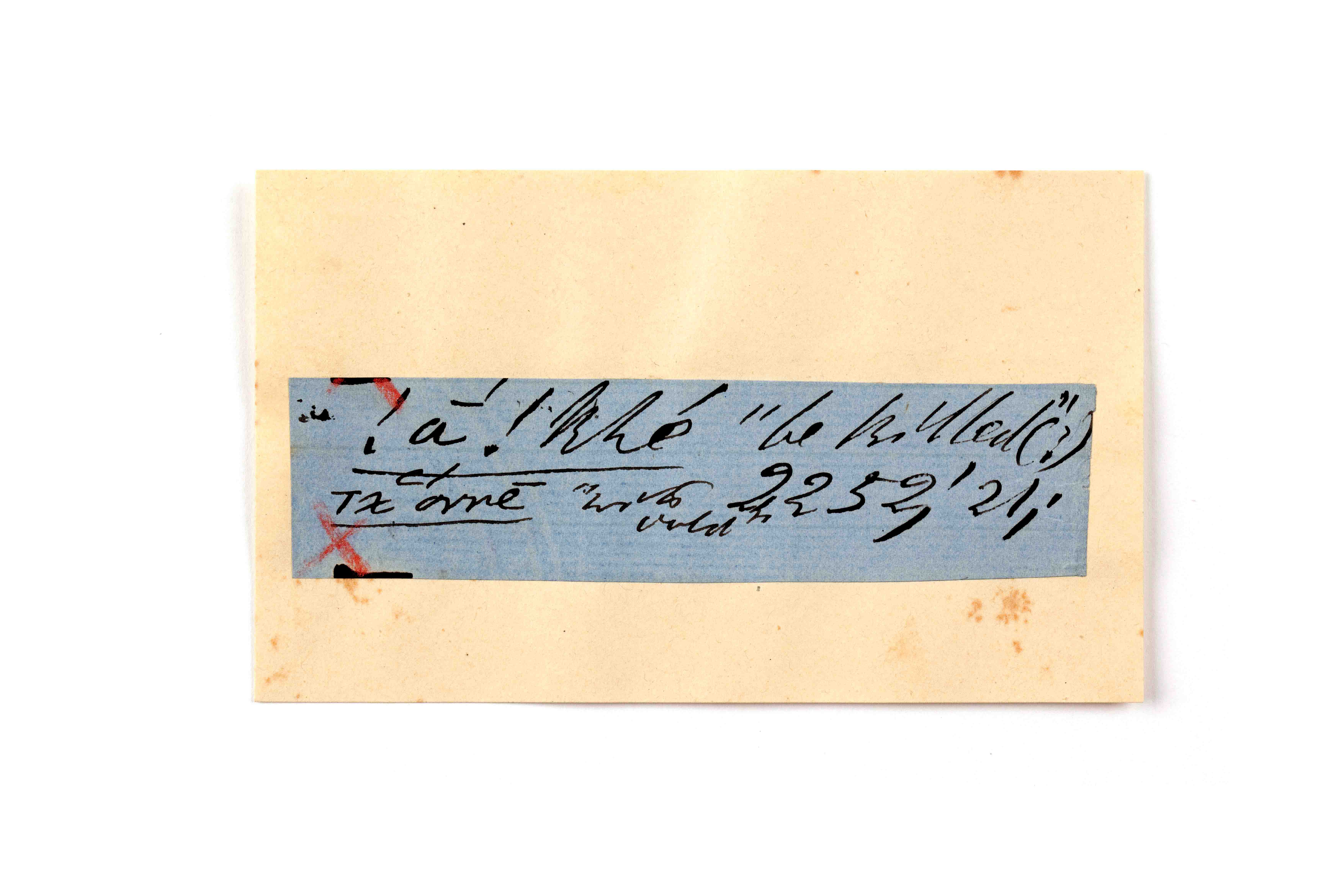 ink on blue paper glued on card