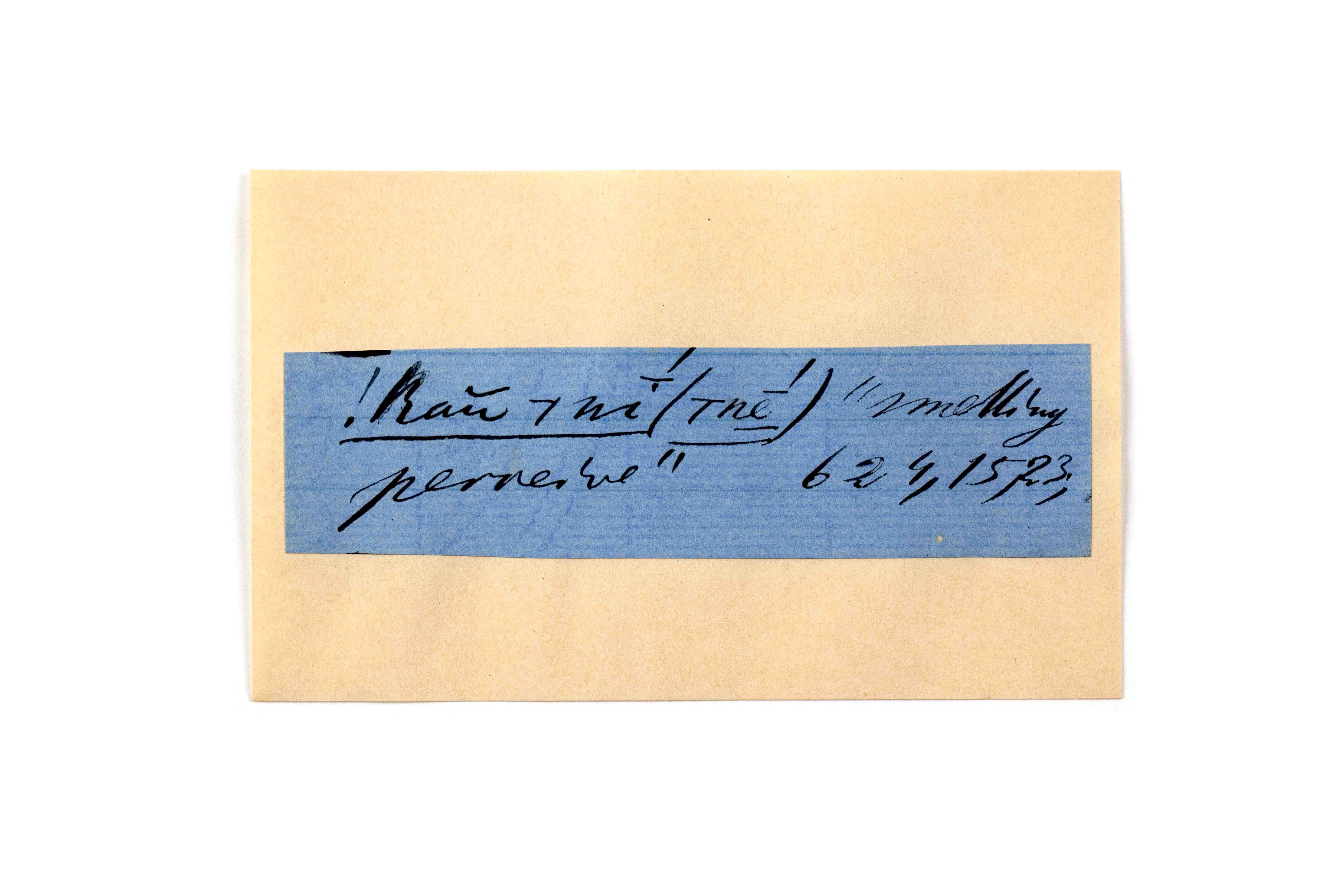 ink on blue paper glued on card