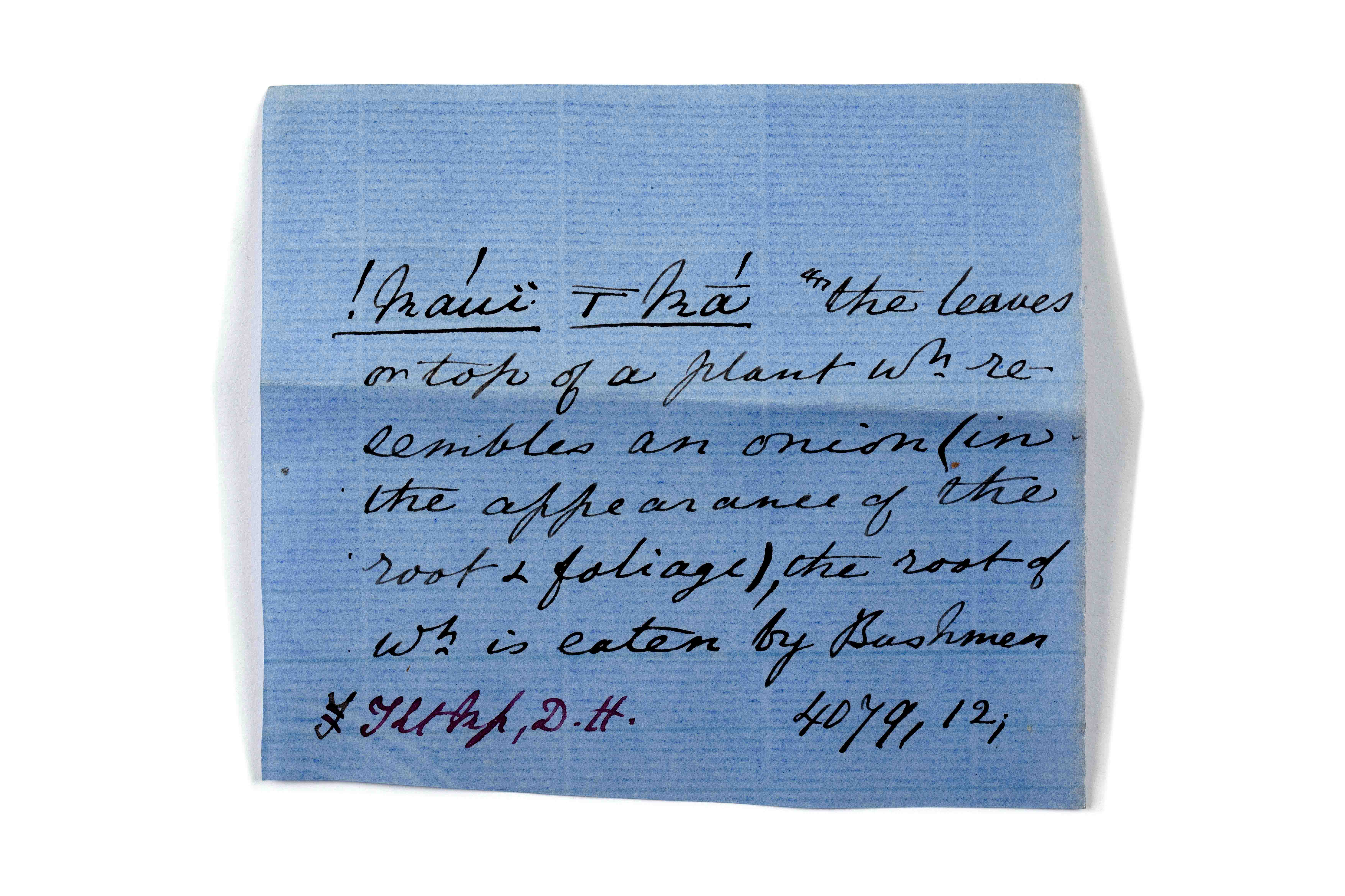 ǃ_1963 leaves on top of a plant which resembles an onion (in the appearance of the root & foliage) (the) (the root of which is eaten by Bushmen)