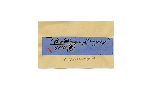 ink on blue paper glued on card