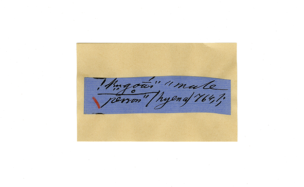 ink on blue paper glued on card
