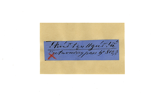 ink on blue paper glued on card