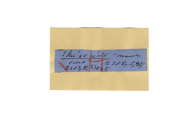 ink on blue paper glued on card