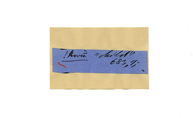 ink on blue paper glued on card