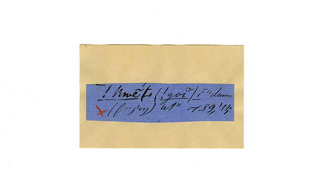ink on blue paper glued on card