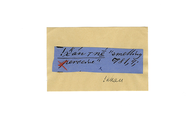 ink on blue paper glued on card