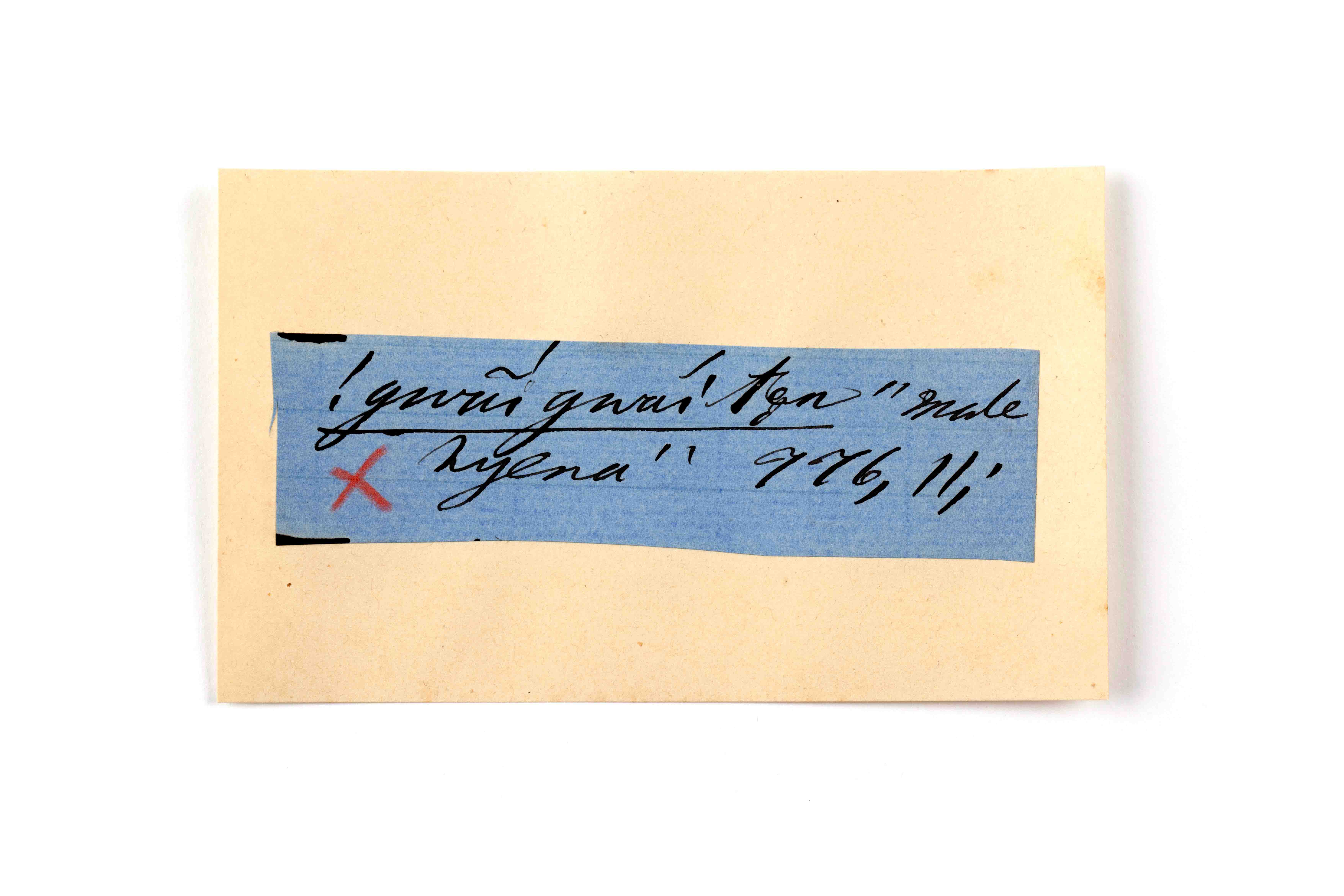 ink on blue paper glued on card