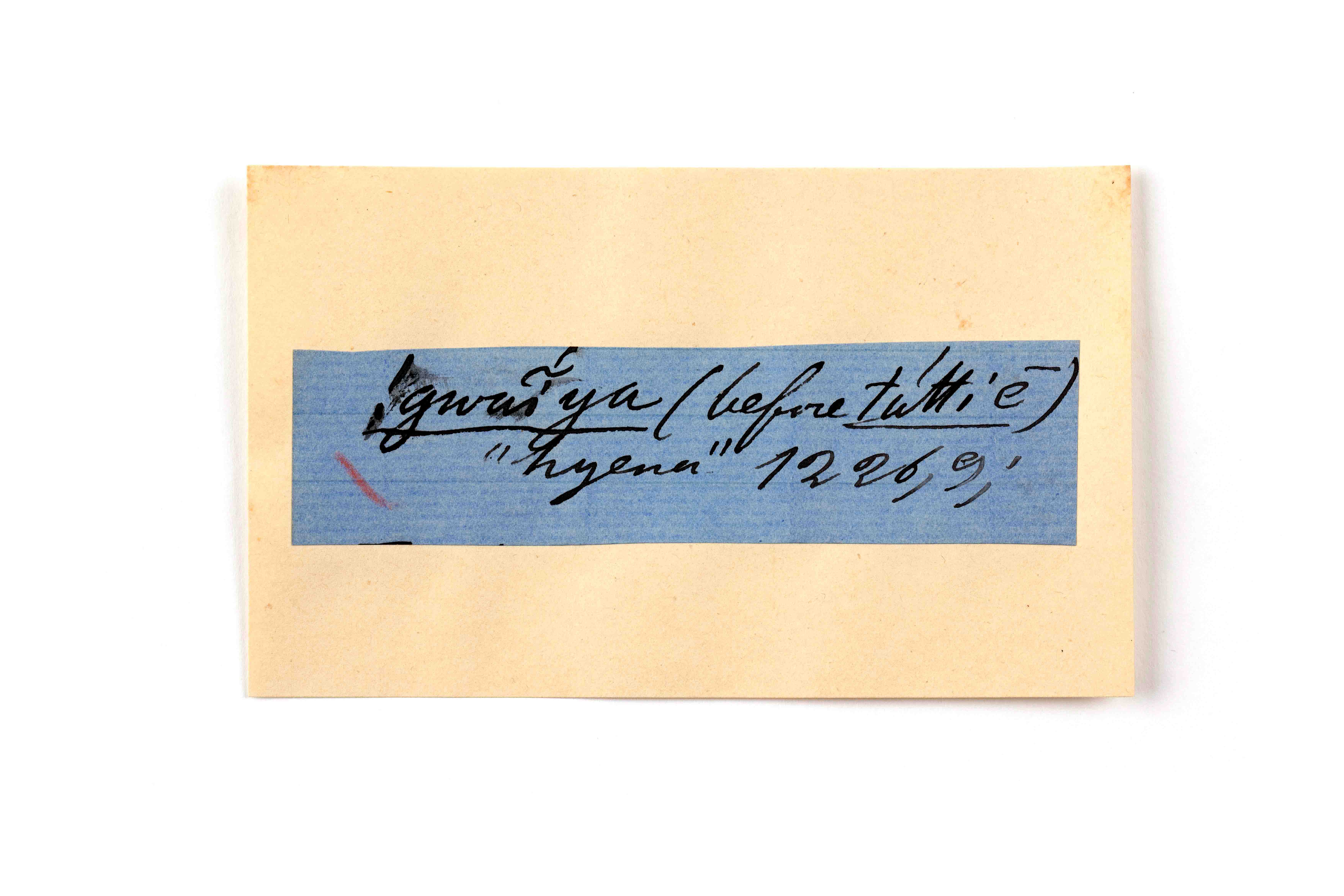 ink on blue paper glued on card
