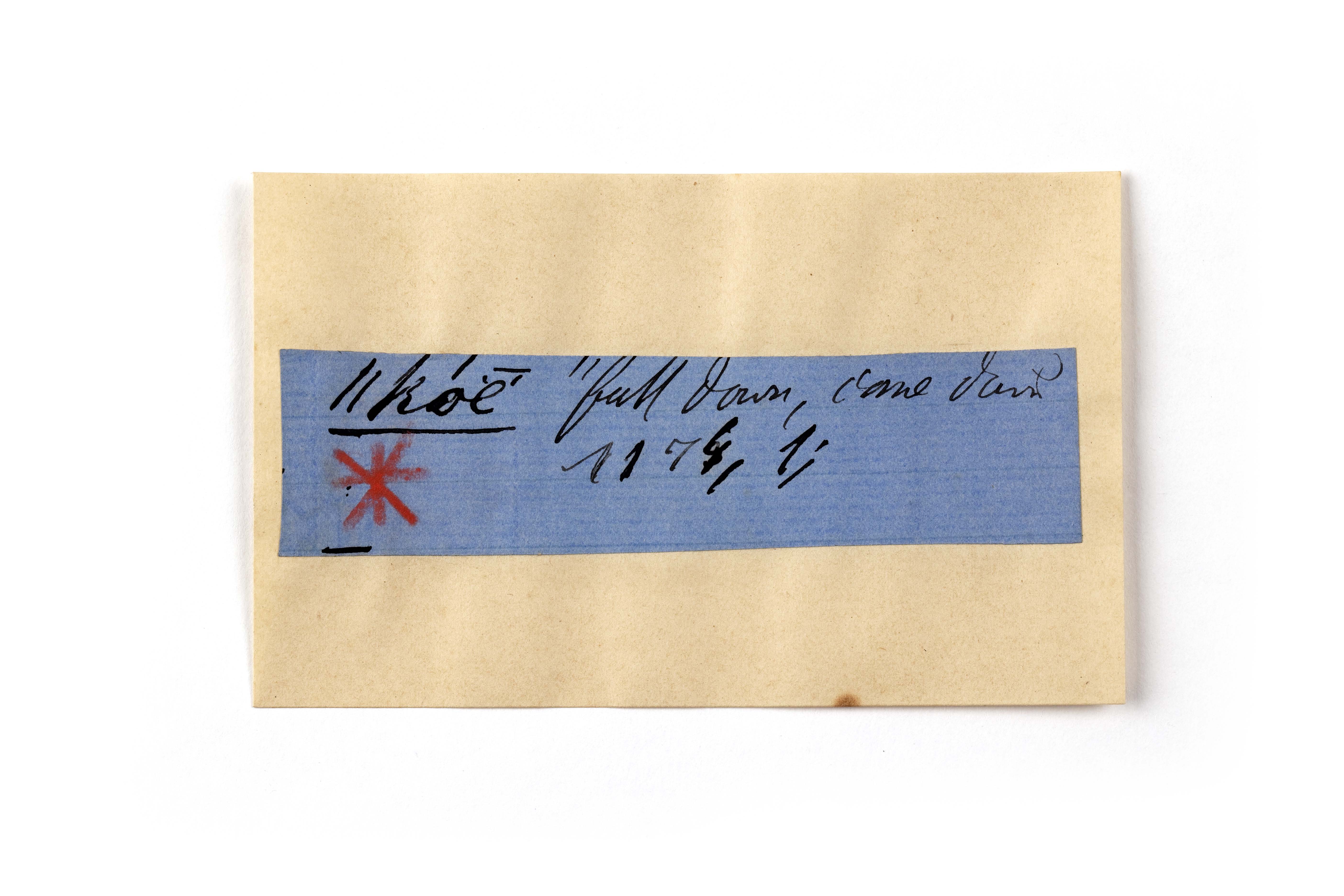 ink on blue paper glued on card