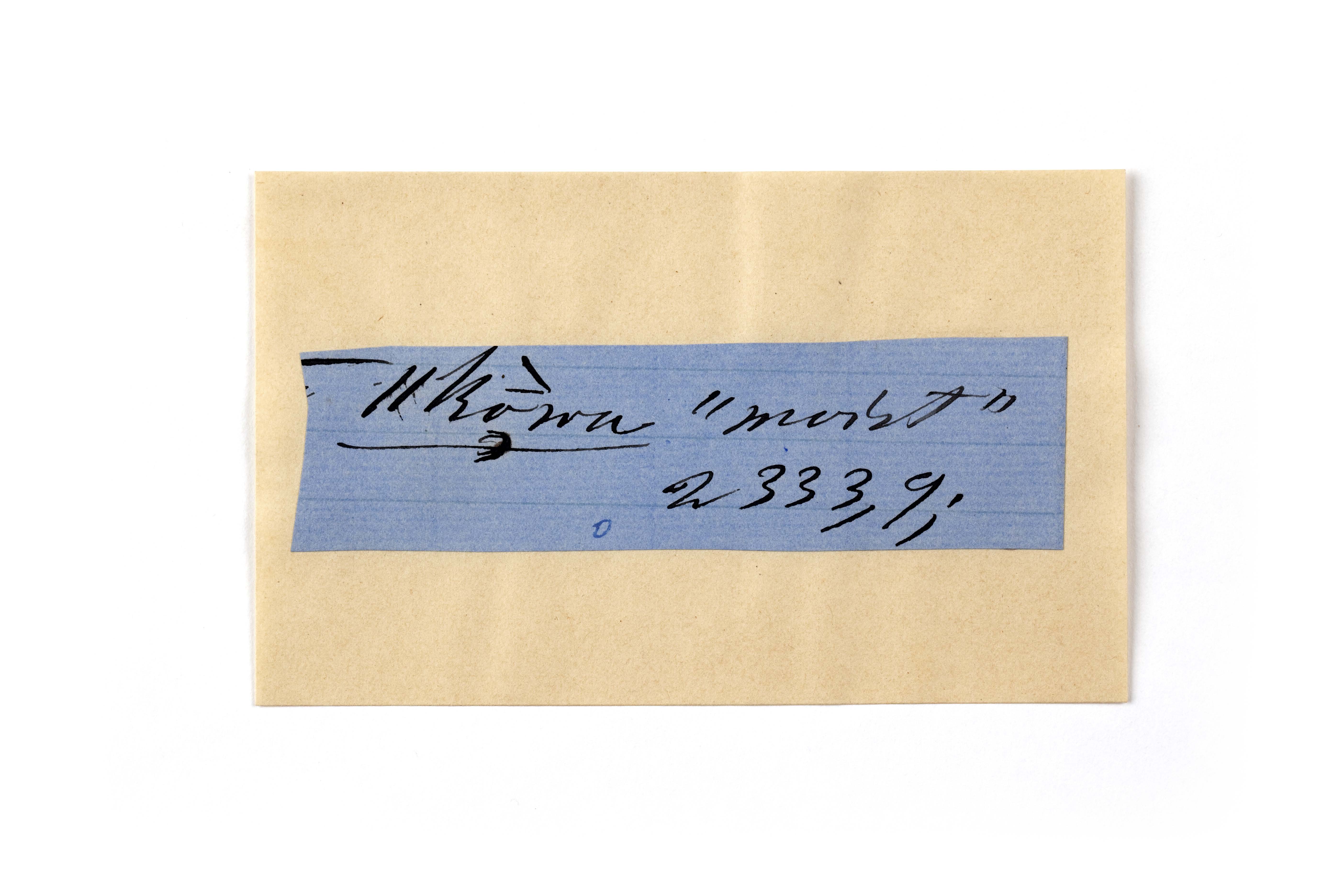 ink on blue paper glued on card