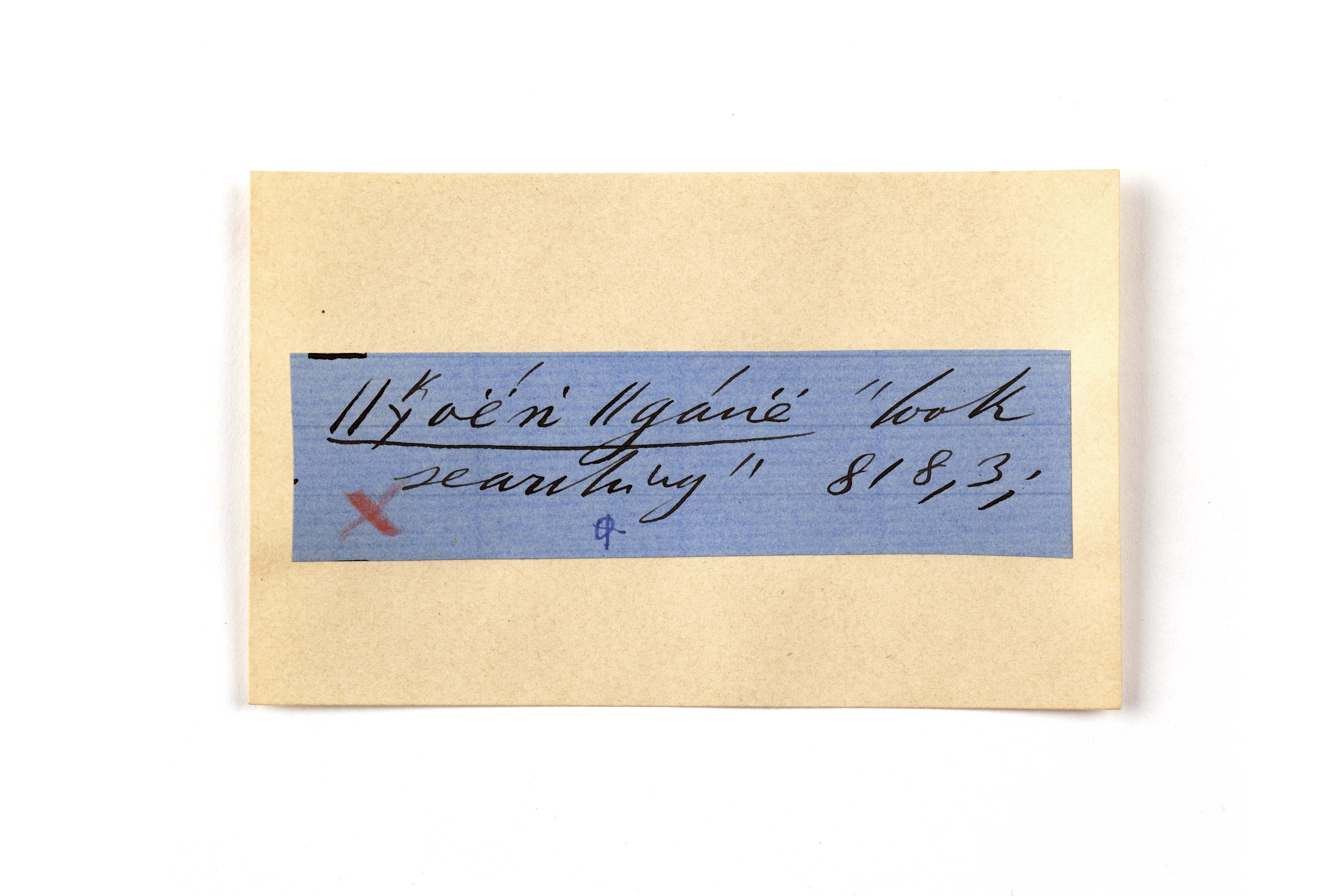 ink on blue paper glued on card