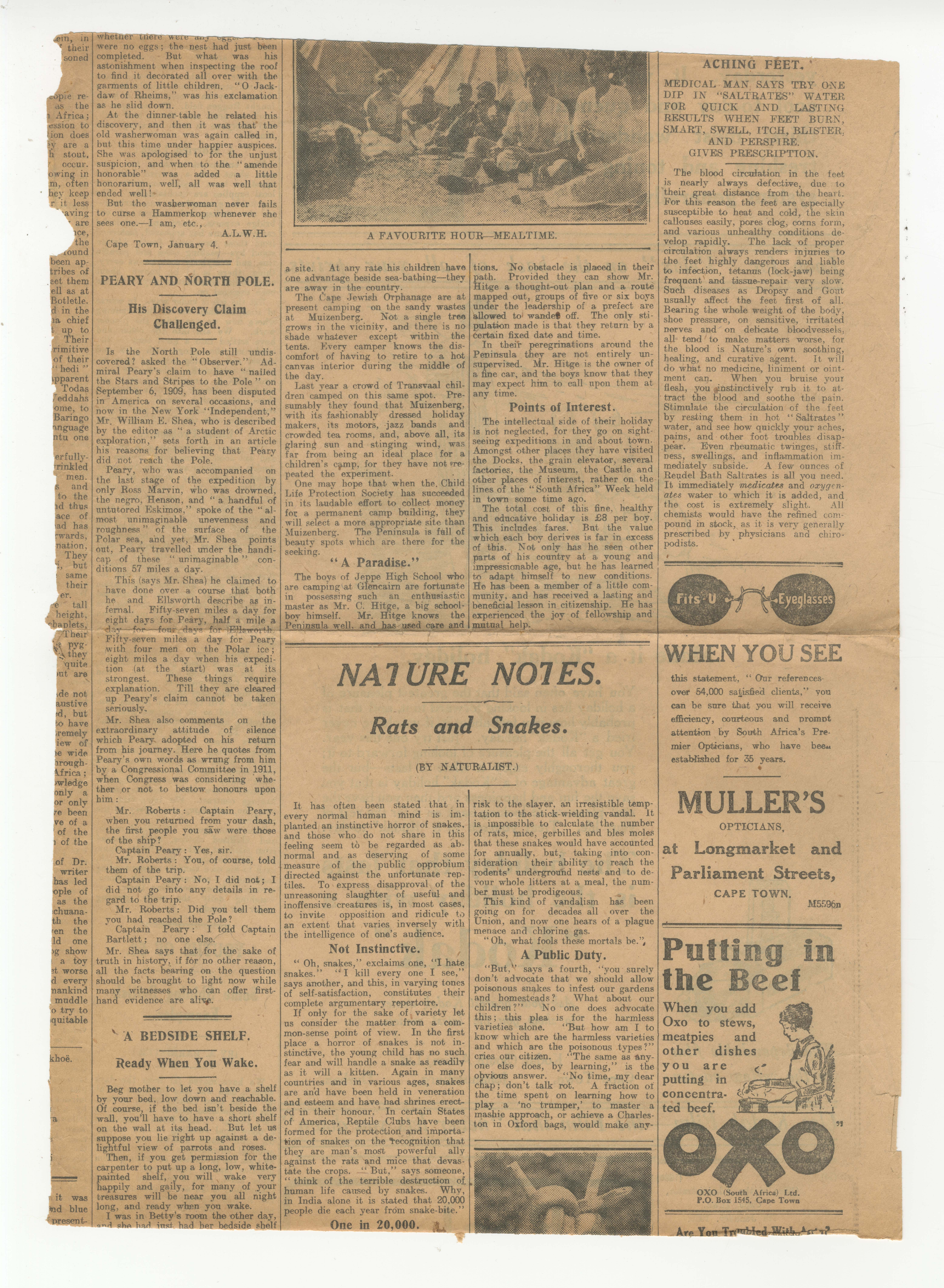 Admiral Peary (his discovery claim challenged), North Pole (Peary's planting of the American flag), Jeppe Boys High School (their Glencairn camp with Mr C Hitge), Mr C Hitge (a master at Jeppe Boys High School), The Cape Jewish Orphanage (camping at Muizenberg), snakes (their indiscriminate eradication), Reudel Bath Saltrates (for aching feet), Muller's (an advertisement for), Oxo (an advertisement for)