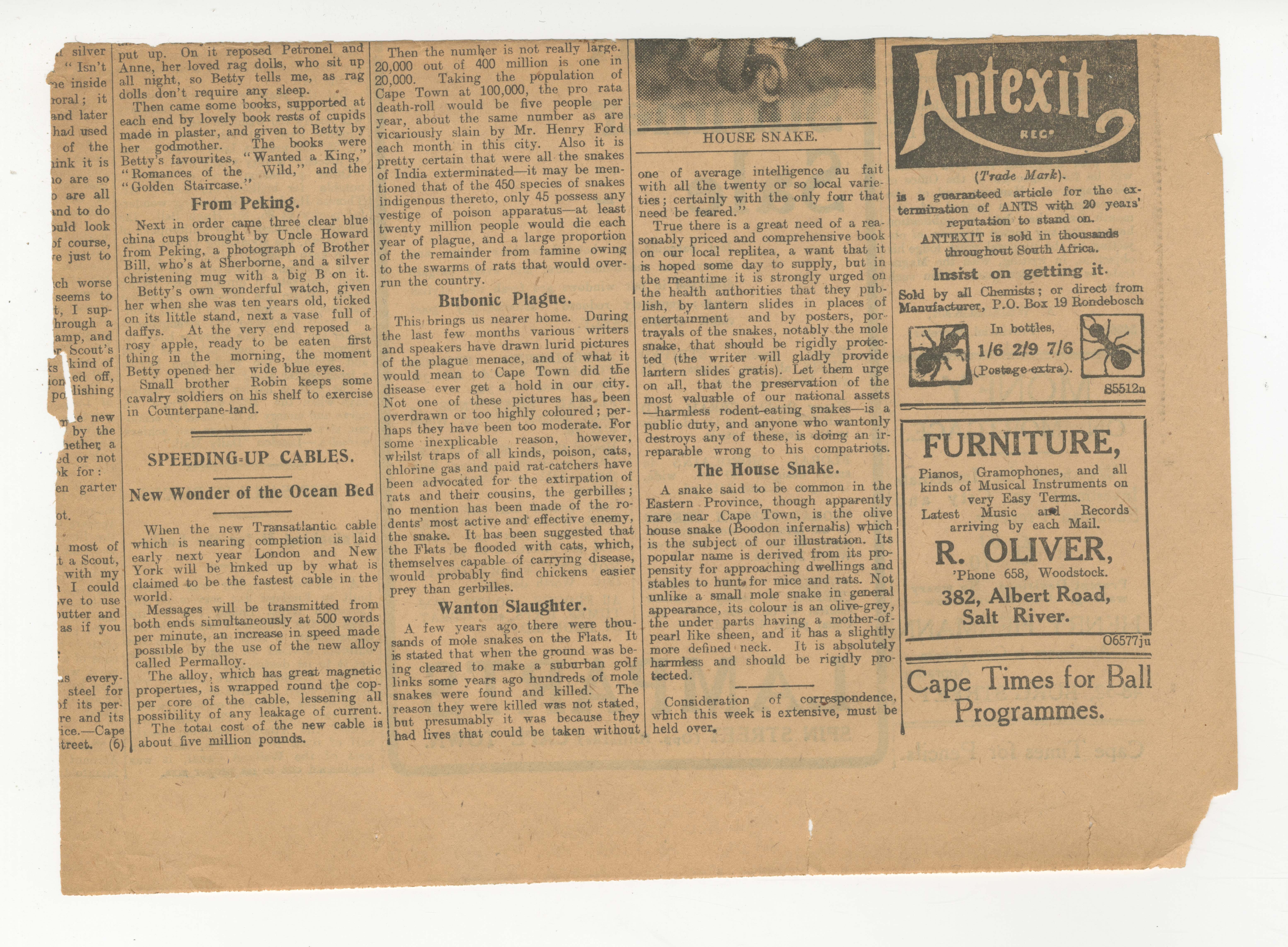 Transatlantic cables (new wonder of the ocean bed), bubonic plague (in Cape Town), Antexit (an advertisement for), R Oliver (a vendor of furniture, musical instruments, and records)