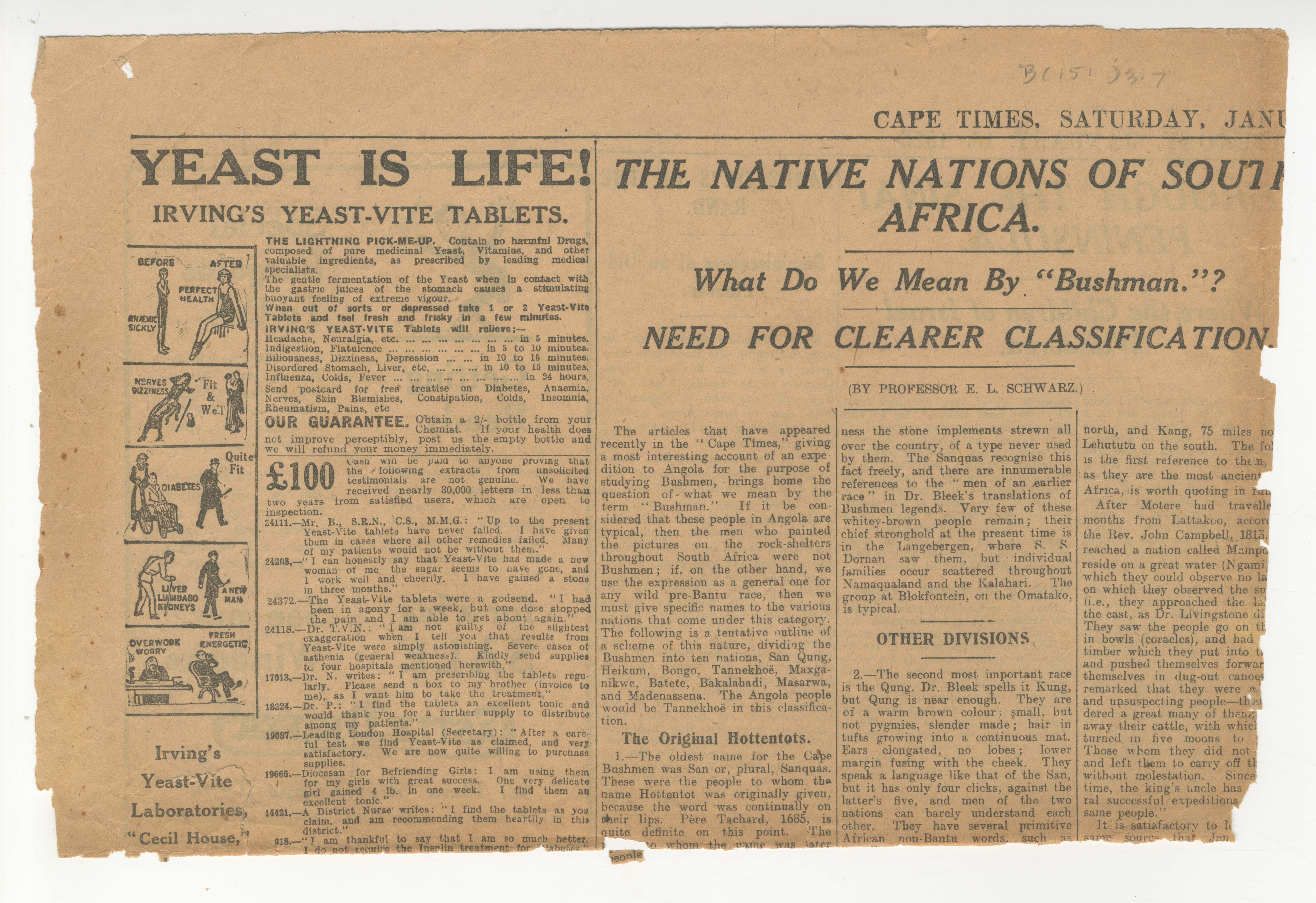 Cape Times, The native nations of South Africa, Bushman (what is meant by it), Langebergen (a primary Bushman stronghold), Early Race (in Bleek's Bushman legends), Professor EL Schwarz (a geologist and geographer), Kung (Bleek transcribed it as), Qung (close enough for Schwarz), Rev. John Campbell, Dr Livingstone, Irving's Yeast-Vite Tablets (an advertisement for)