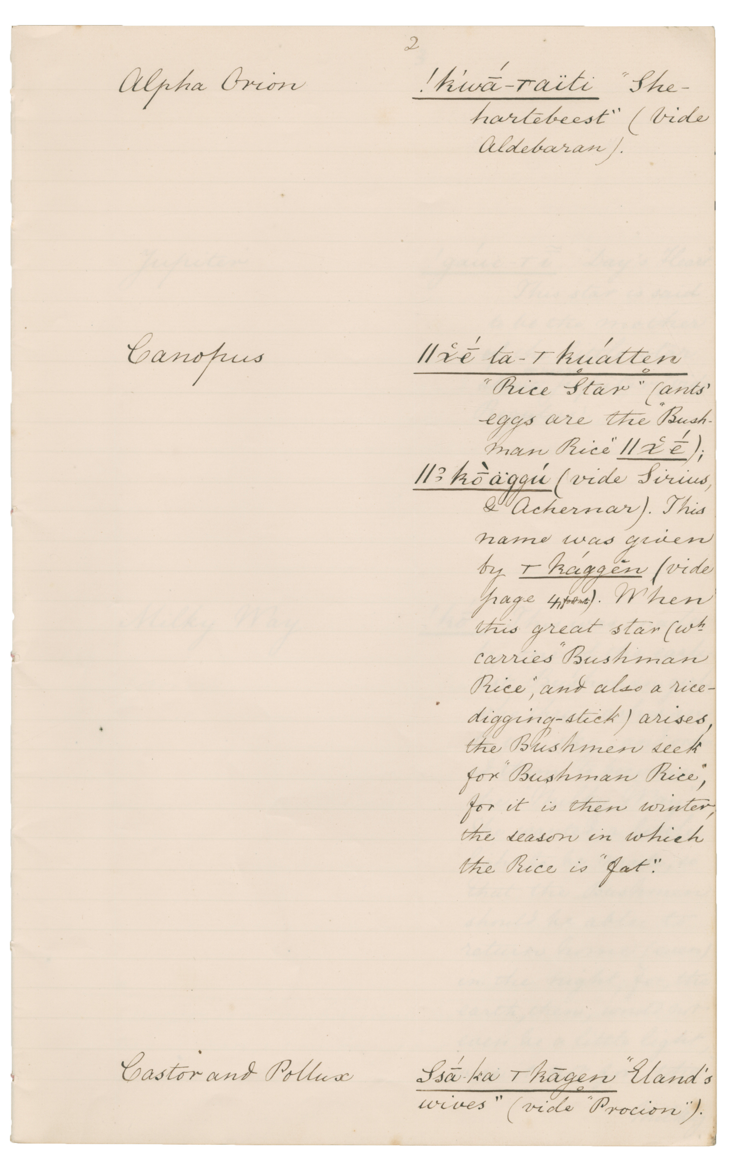 Alpha Orion (she hartebeest), Aldebaran, Canopus (rice star), ants eggs, Sirius, Achernar. Bushmen Rice, winter (the season in which rice is fat), Castor (eland's wives), Pollux (eland's wives), Procyon