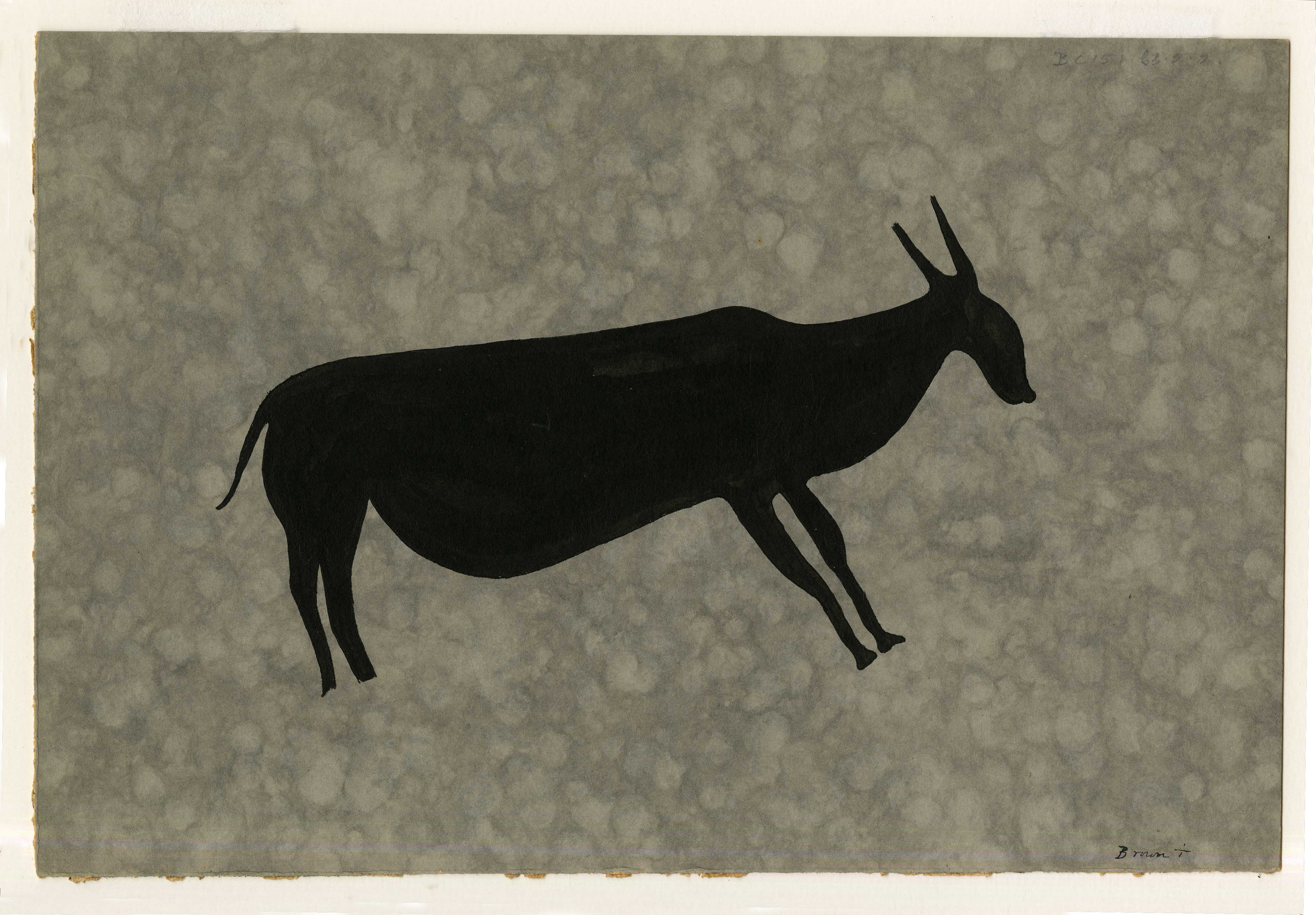 A rock art copy likely done by someone recorded as 'Brown T', who (if rightly intuited) might be a lesser-known copyist. The mottled grey backdrop is reminiscent of Helen Tongue's rock art copies reproduced as colour chromocollotype plates published in her book 'Bushman Paintings' (1909) by Clarendon Press, Oxford.