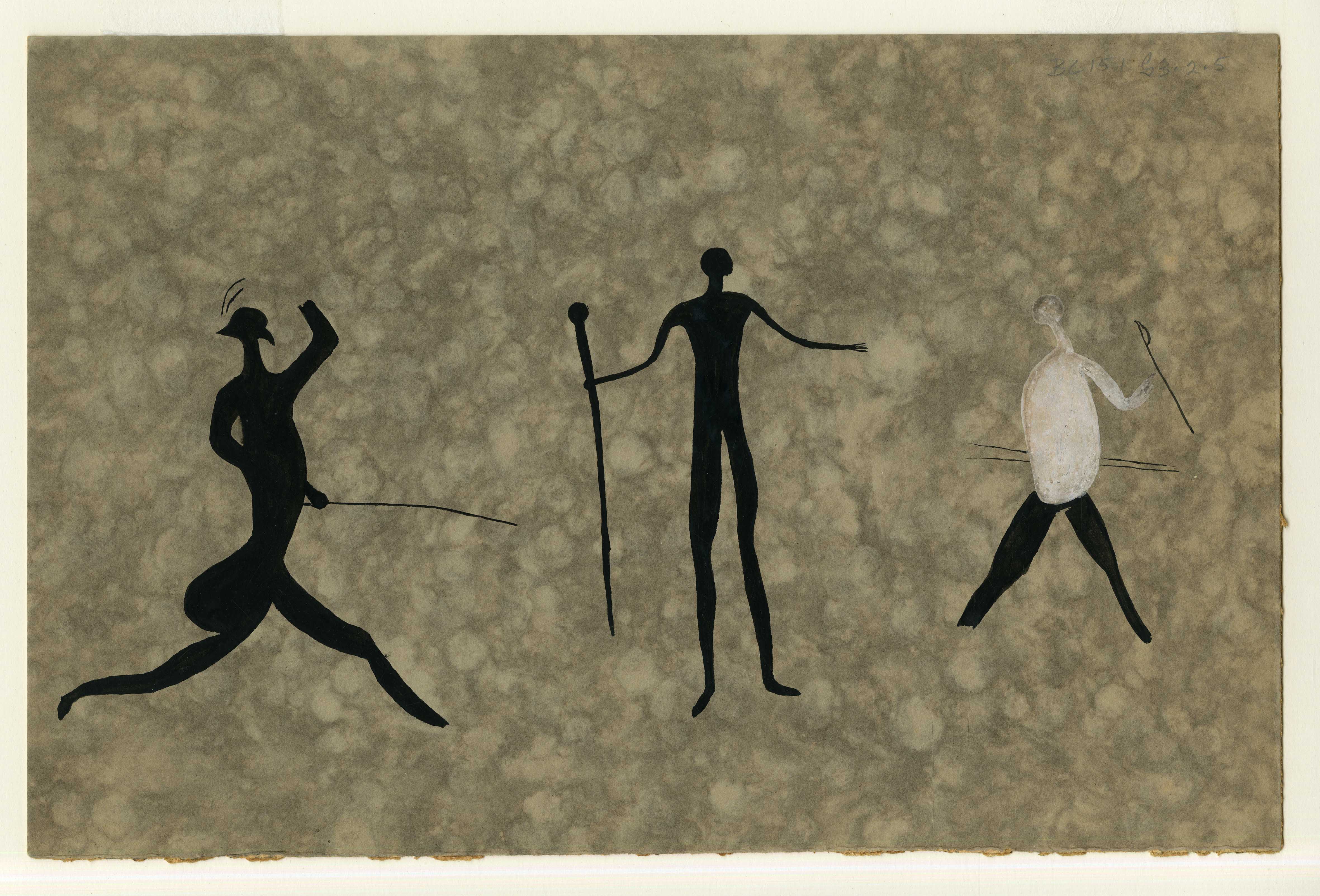 Painted copy of Bushman rock art done from tracings, with 'Egoso, three separate figures' written on the verso.