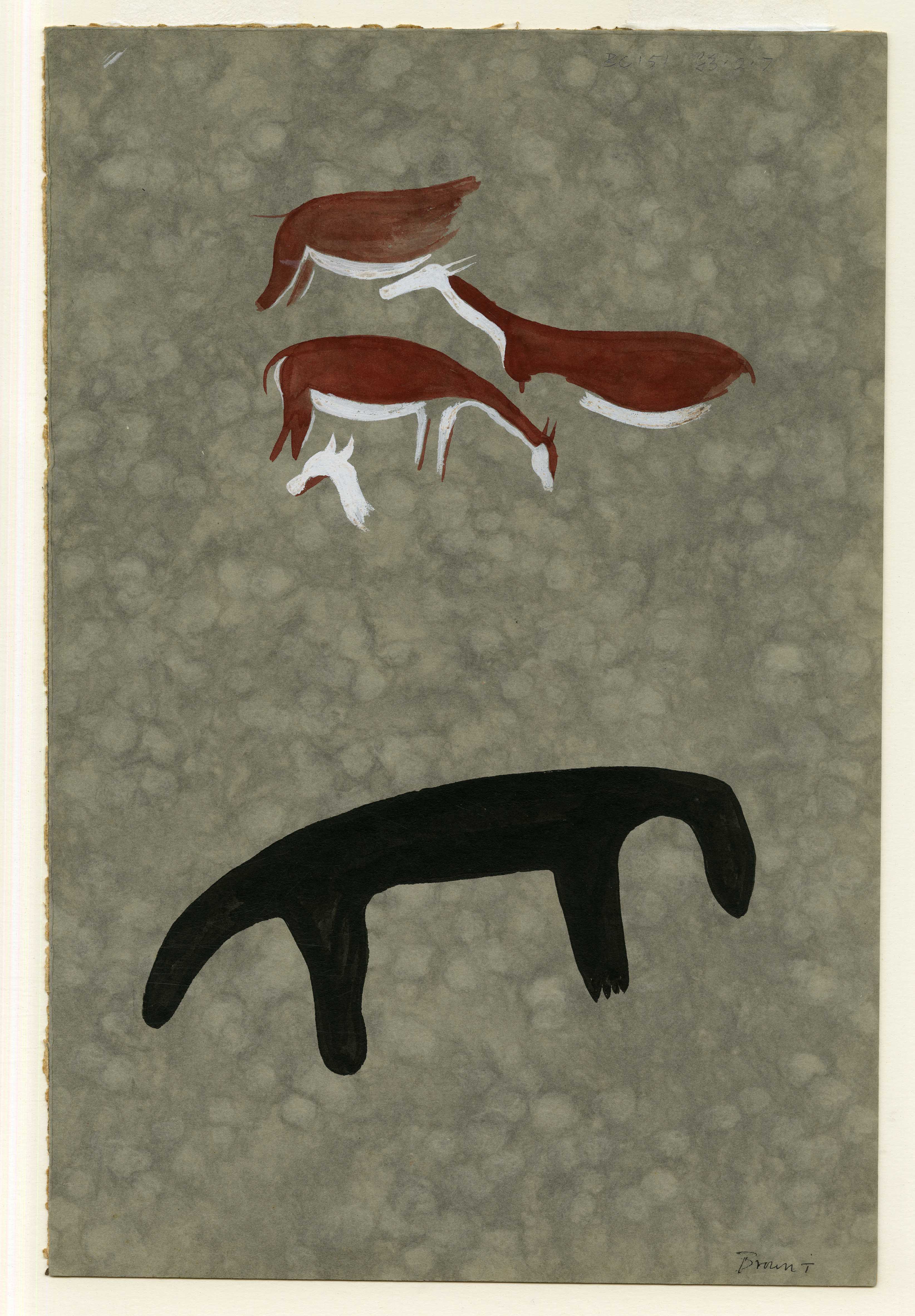 A rock art copy likely done by someone recorded as 'Brown T', who (if rightly intuited) might be a lesser-known copyist. The mottled grey backdrop is reminiscent of Helen Tongue's rock art copies reproduced as colour chromocollotype plates published in her book 'Bushman Paintings' (1909) by Clarendon Press, Oxford.