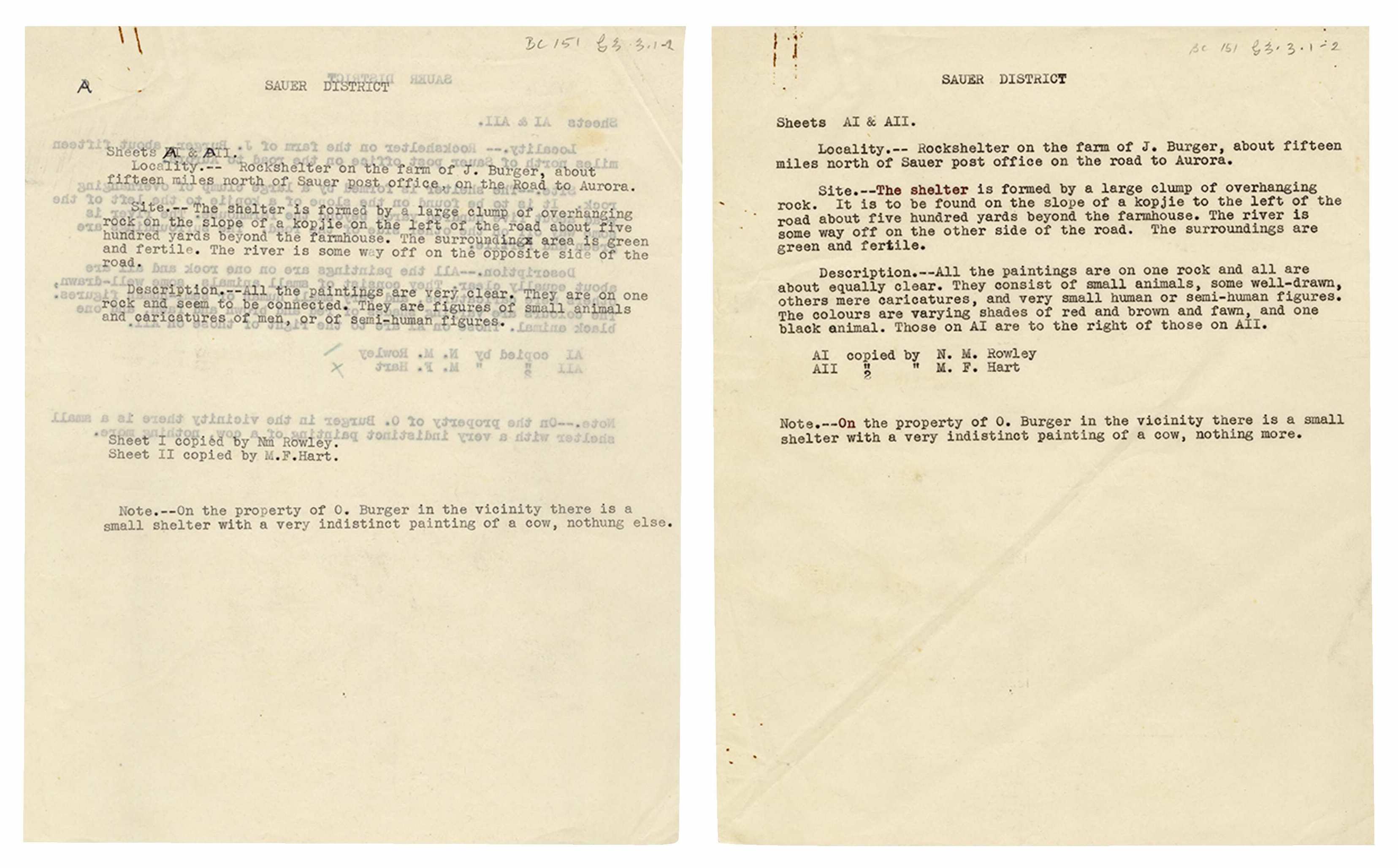 Typewritten notes on location (A1-2 [copies of rock art]), Sauer District. TSS.