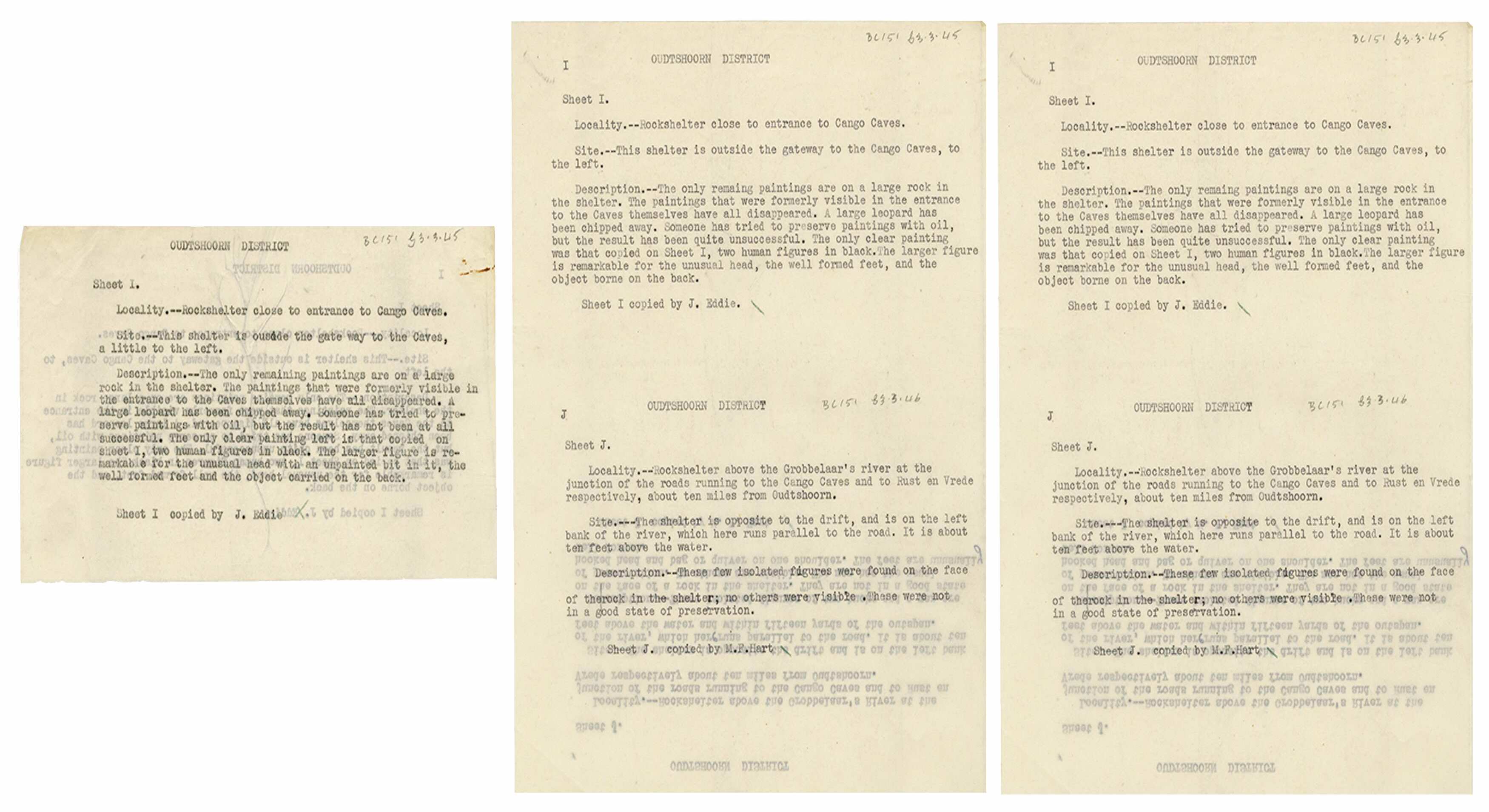 Typewritten notes on location (I and J [copies of rock art]), Oudtshoorn District. TSS.