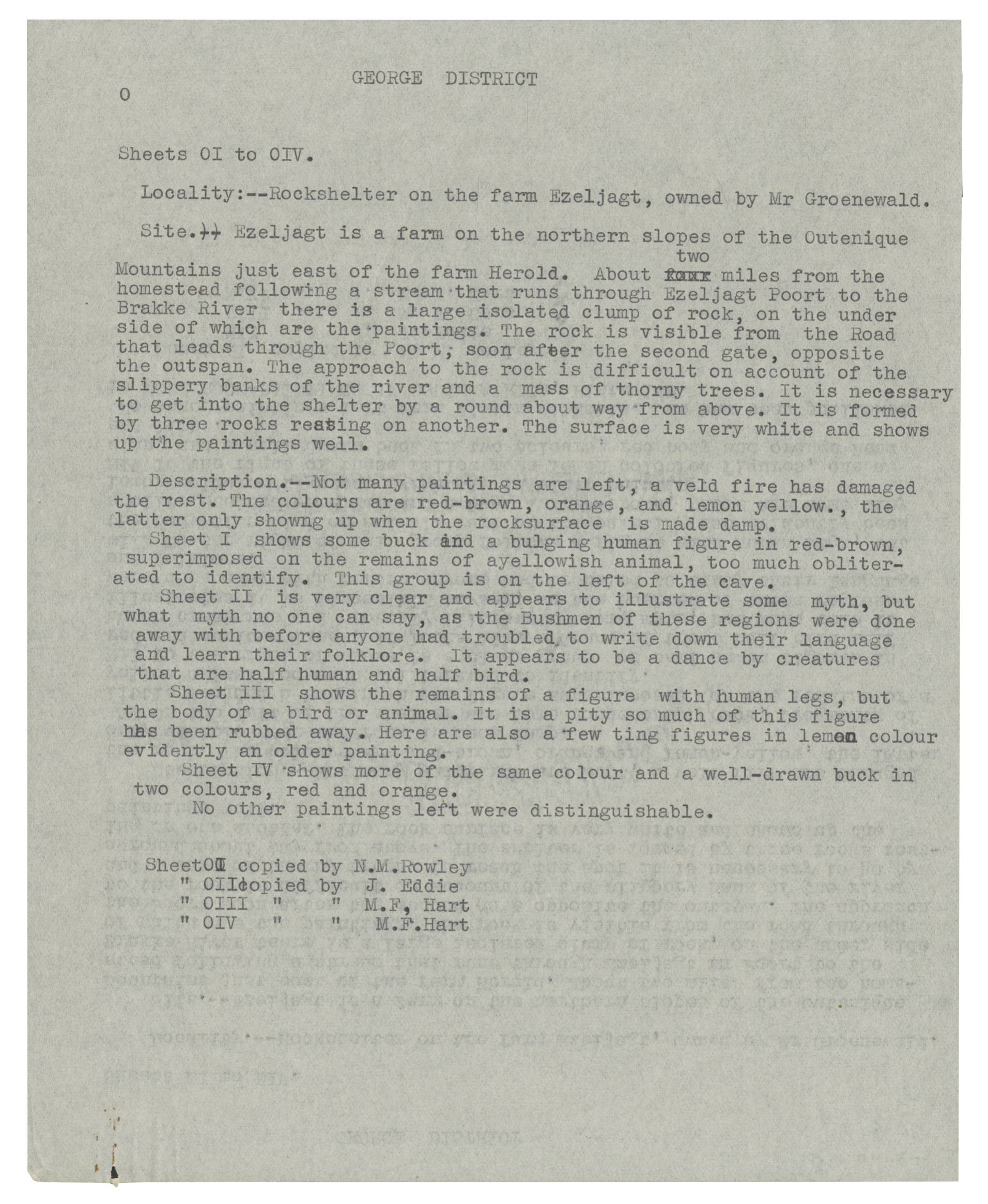 Typewritten notes on location (O1-4 [copies of rock art]), George District. TSS. A duplicate (unannotated).