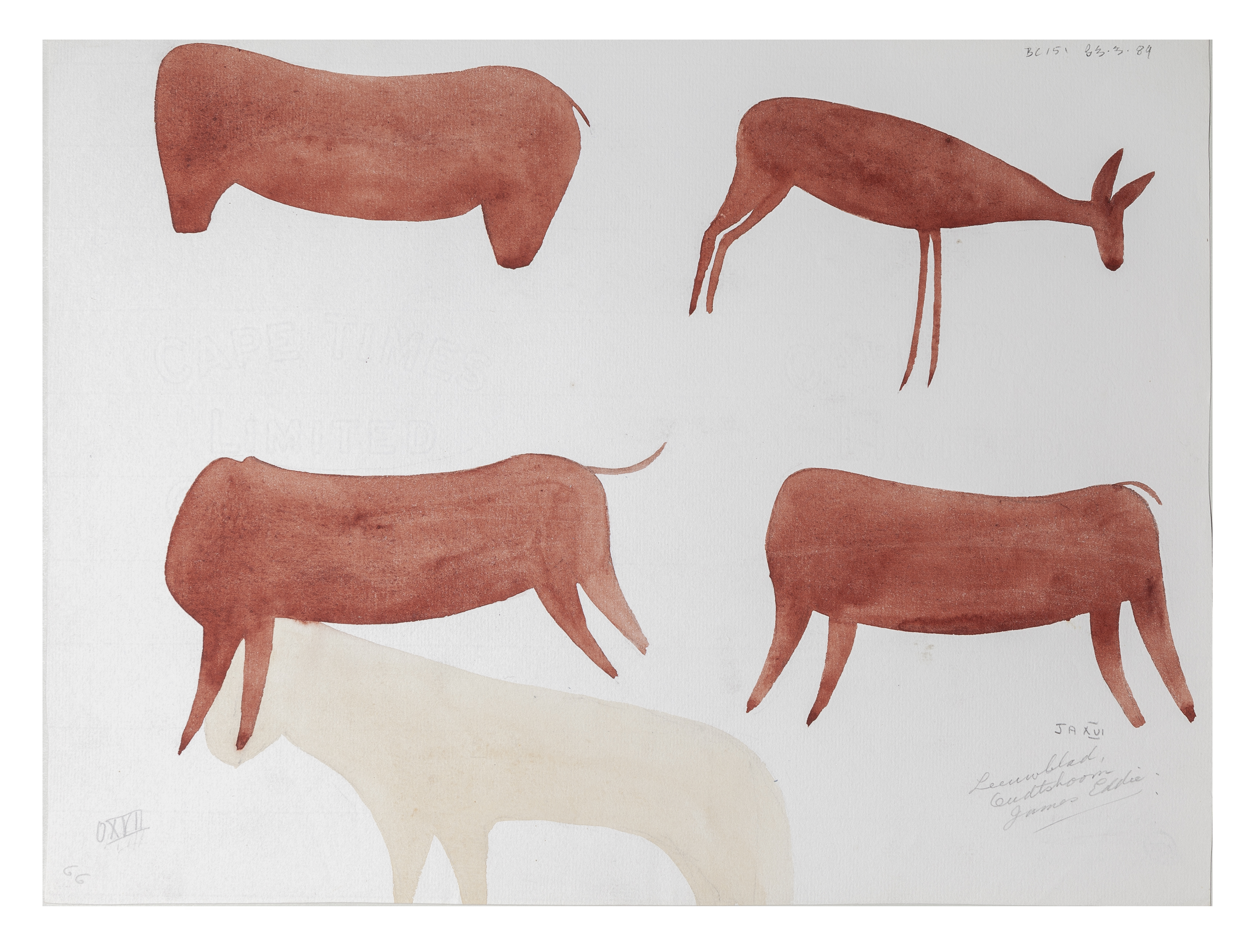 Copy of rock art (O17), Leeuwblad, Oudtshoorn. The paper is watermarked 'CAPE TIMES LIMITED CAPE TOWN'.