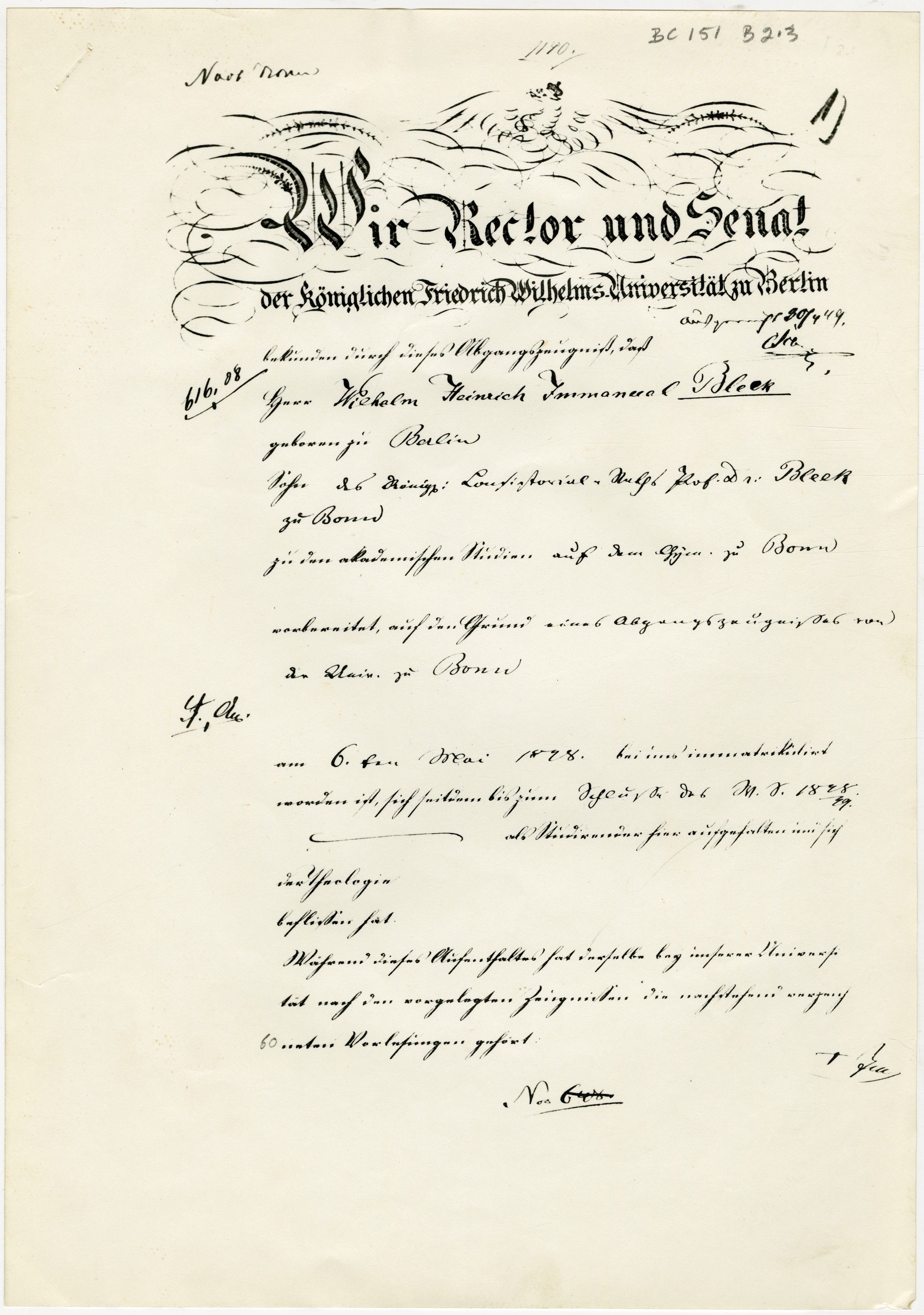 For eight years, Wilhelm Bleek (1827-1875) attended a gymnasium in Bonn. Bleek undertook tertiary studies from 1845 to 1851, enrolling with Bonn's theology faculty for his first course in the winter semester of 1845/6 (Bank, 2006: 15-16). He moved across to 'Berlin University' (i.e., the Friedrich Wilhelm University of Berlin) in his third year of undergraduate study, returning to Bonn in the summer semester of 1849 and concluding his 'final semester of formal study' there in the winter of 1850/1 (Bank, 2006: 18). Bleek graduated with a PhD in Linguistics from Bonn in 1851.