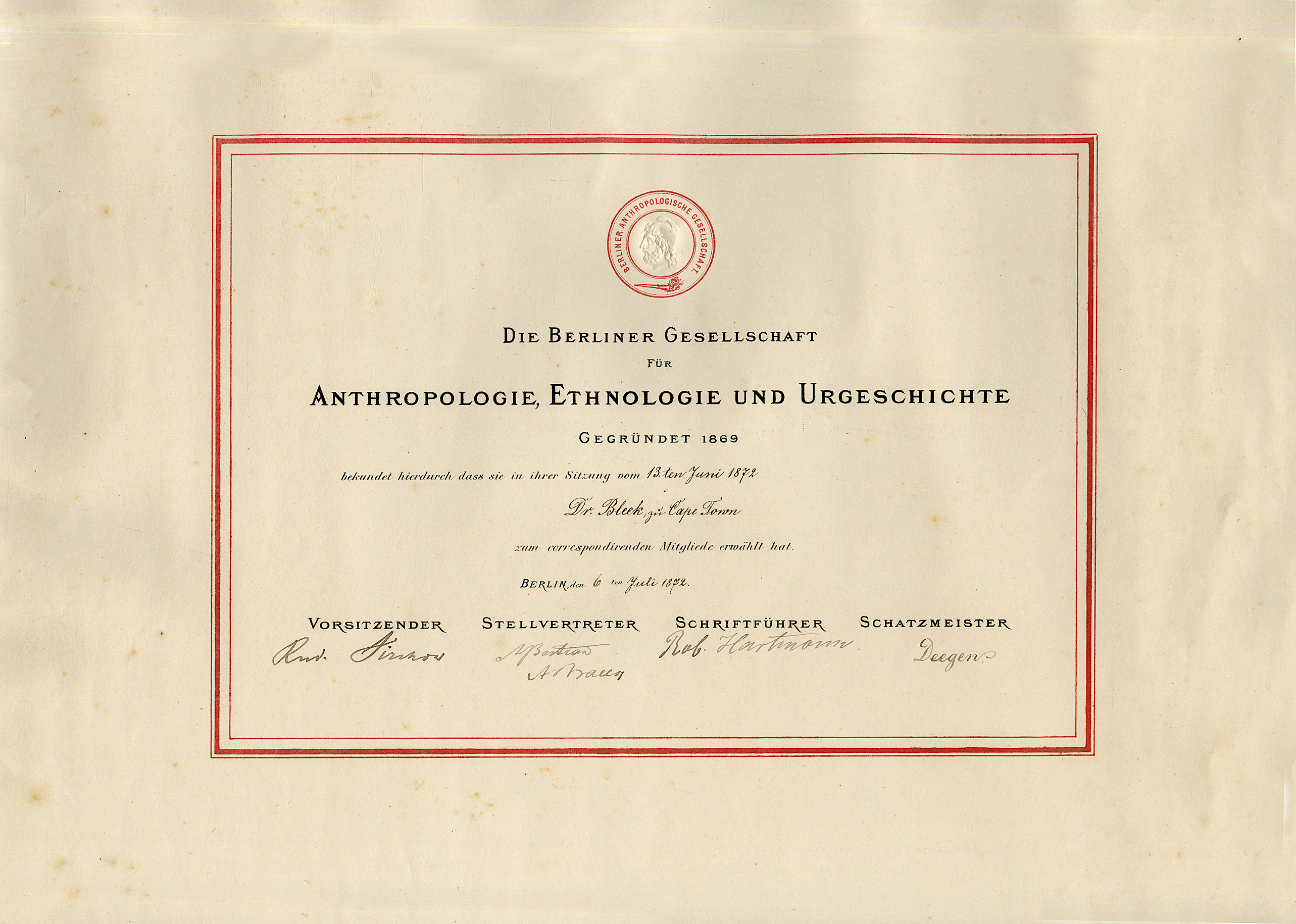 The Deetz Catalogue (i.e., the 'Family Collection') transcription reads '[...]Die Berliner Gesellschaft für Anthropologie, Ethnologie und Urgeschichte Gegründet 1869 bekundet hierdurch dass sie in ihrer Sitzung vom 13ten Juni 1872 Dr. Bleek, zu Cape Town zum correspondierenden Mitgliede erwählt hat. Berlin, den 6ten Juli 1872.