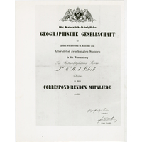 certificates and other records (concerning WHI Bleek), membership diploma, of WHI Bleek, Imperial-Royal Geographical Society (of Vienna)
