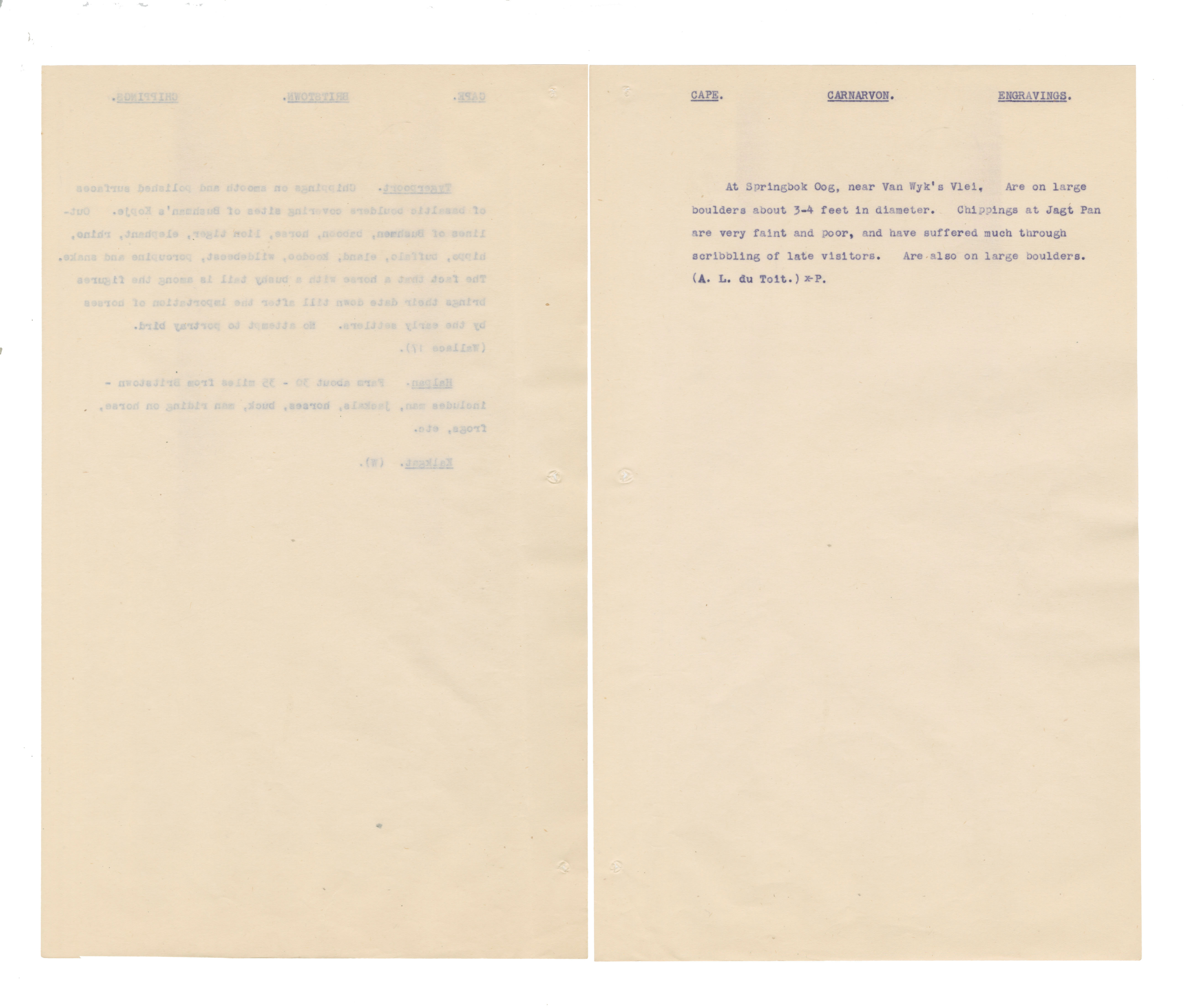 Typewritten notes (facsimiles?) on sheer paper about southern African rock engravings.