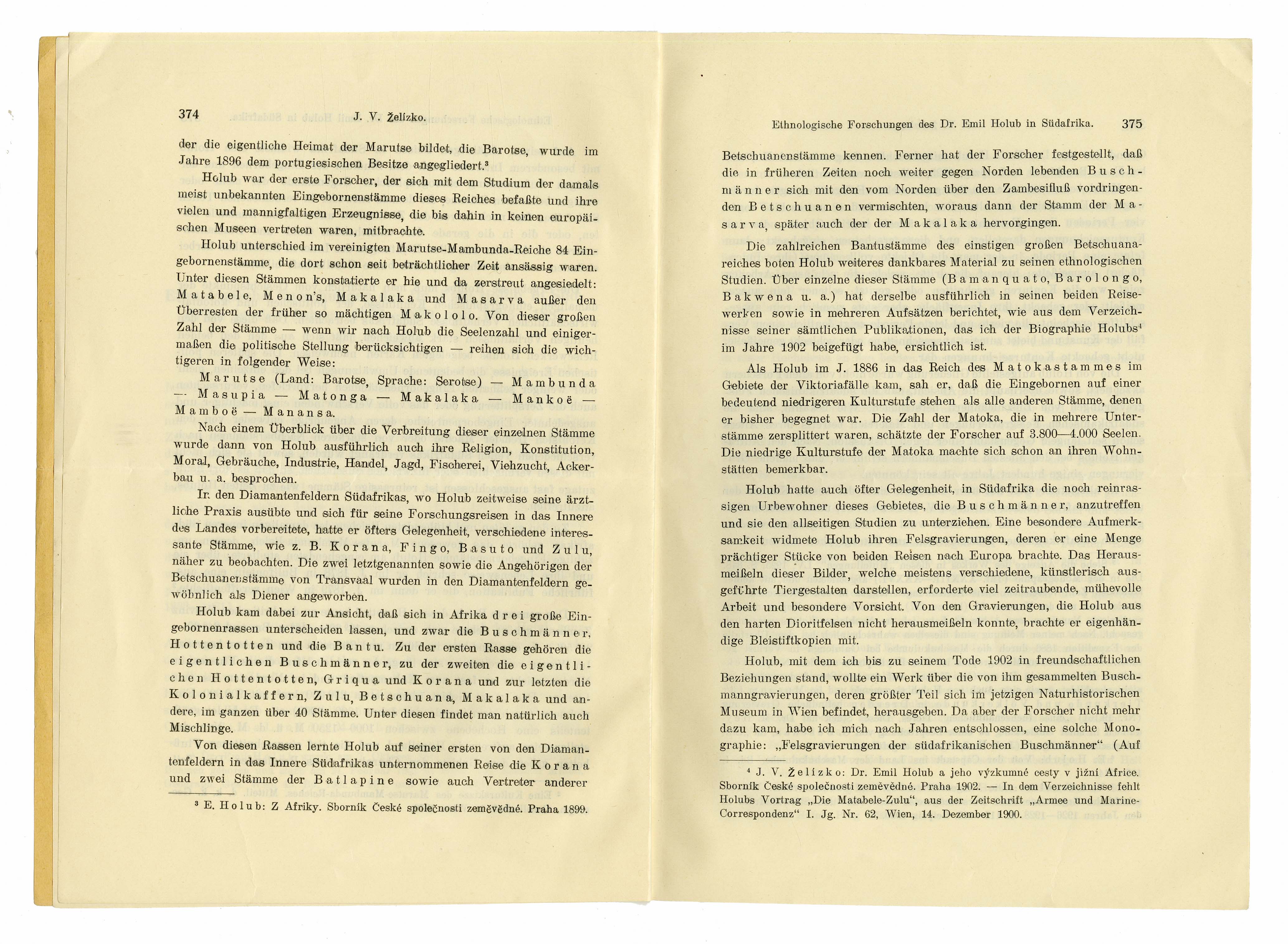 Reprint of 'Ethnologische Forschungen des Emil Holub in Südafrika in den Jahren 1872-1879 und 1883-1887' from Viennese periodical, Mitteilungen der Geographischen Gesellschaft (pp. 372-378).